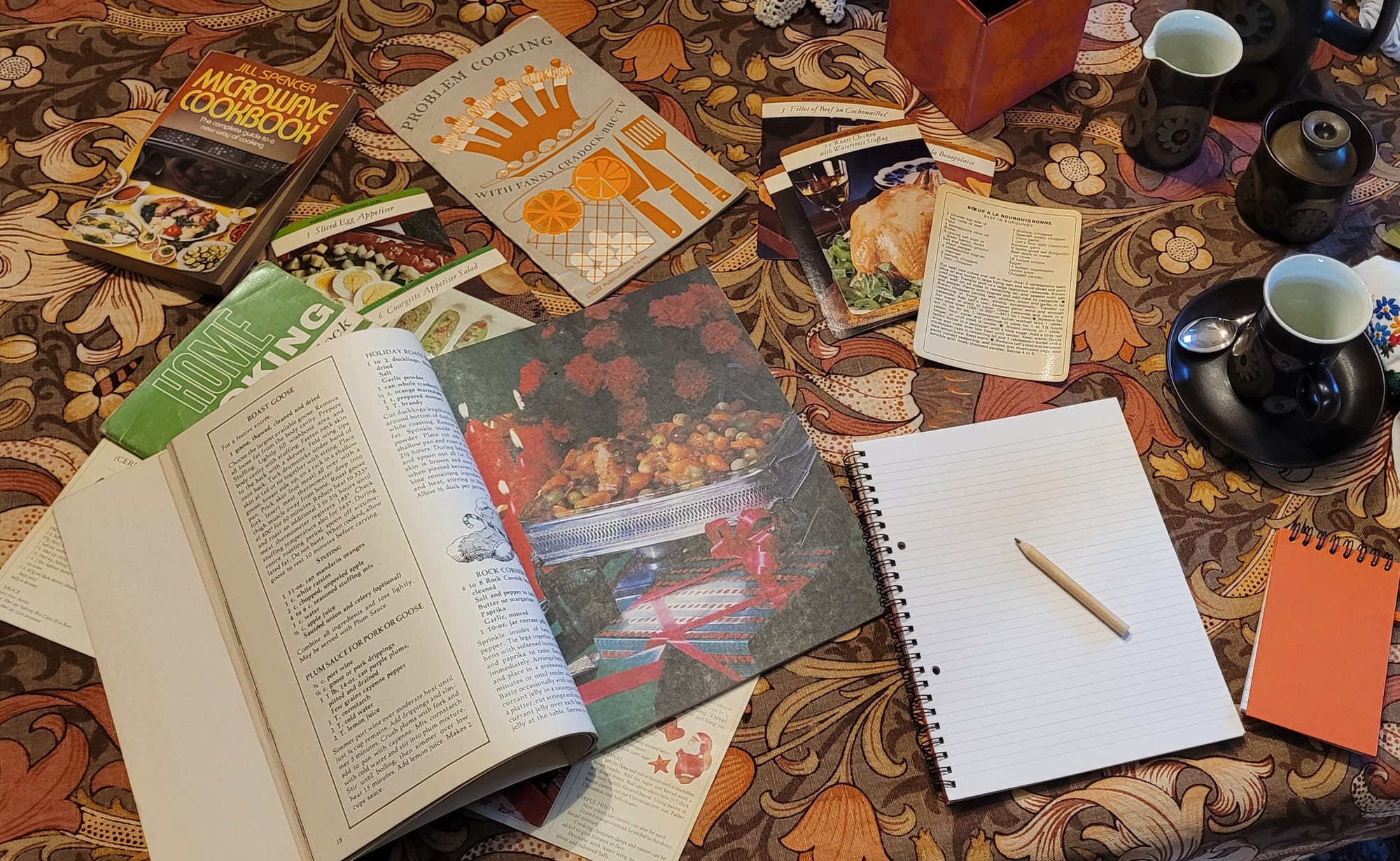 The lived-in feel of a busy family home is conveyed through the many period details: Blue Peter, Rupert Bear and Camberwick Green annuals are littered about the house along with abandoned toys strewn on the staircase. In the dining room, with its William Morris tablecloth (in typical 70s brown and orange shades), it is as if Rumer Godden has just left in the middle of planning the Christmas meal menus, using Fanny Cradock cookery books and Robert Carrier Cook Box recipe cards. The Georgian nightgown that is usually laid on the bed in the King's Room is replaced with a wonderfully bright dress draped on a purple and lilac flowery bedspread.