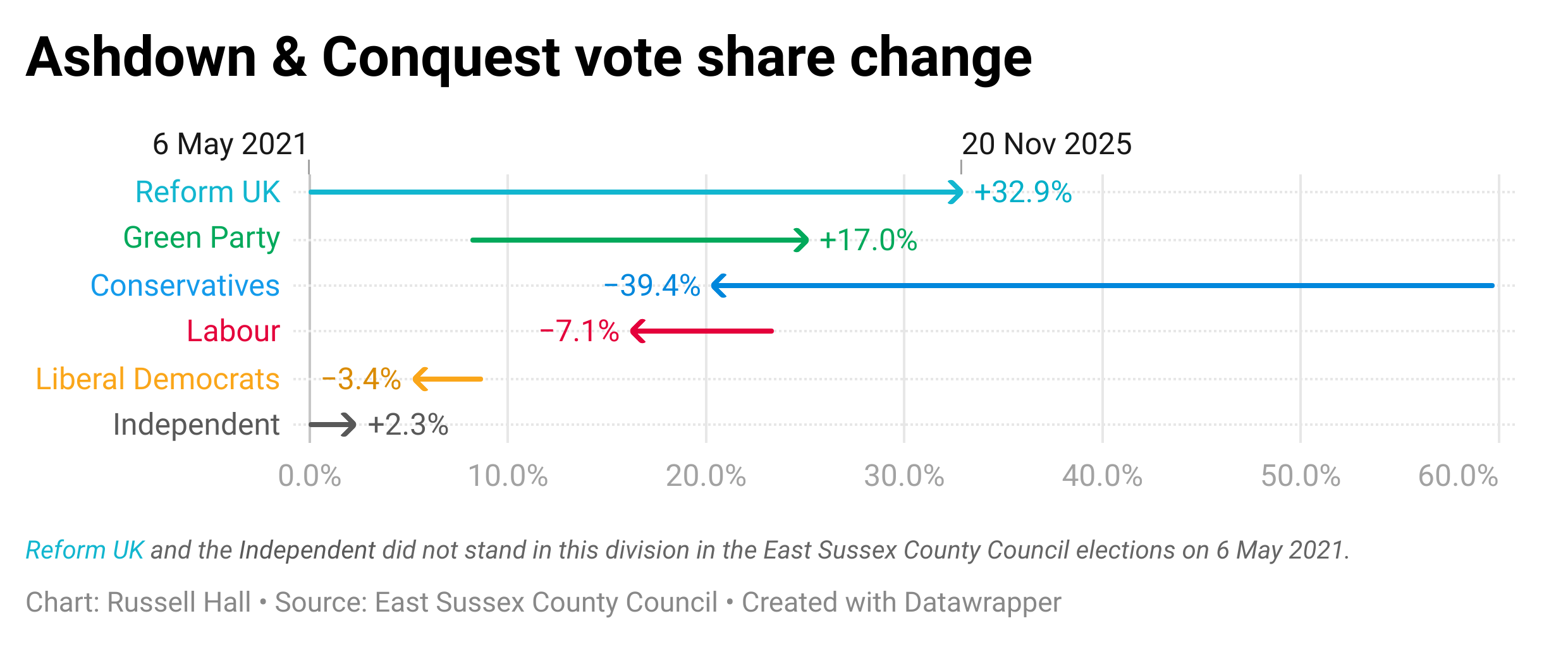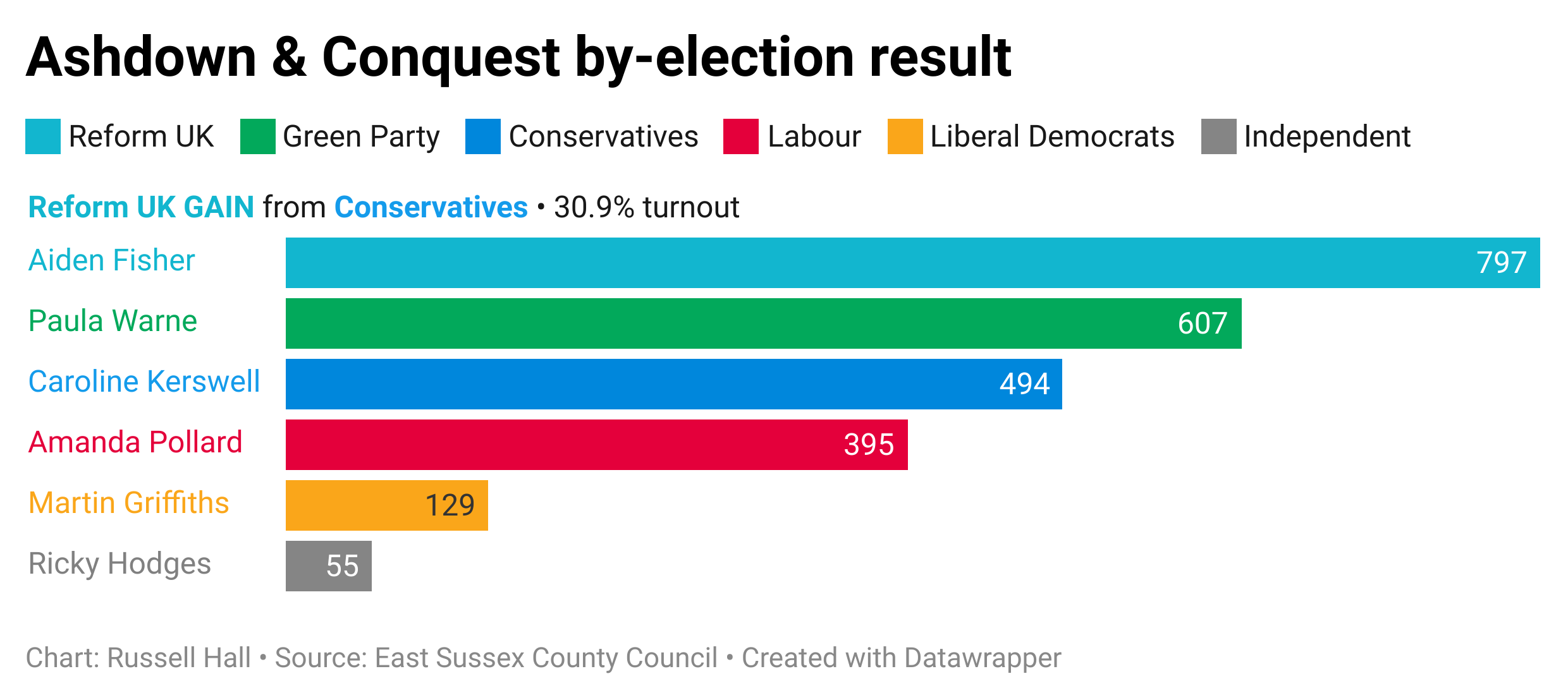 He received 32.9% of the vote in the Ashdown and Conquest ward by-election. There was a 30.9% turn out in the vote on 18 November.