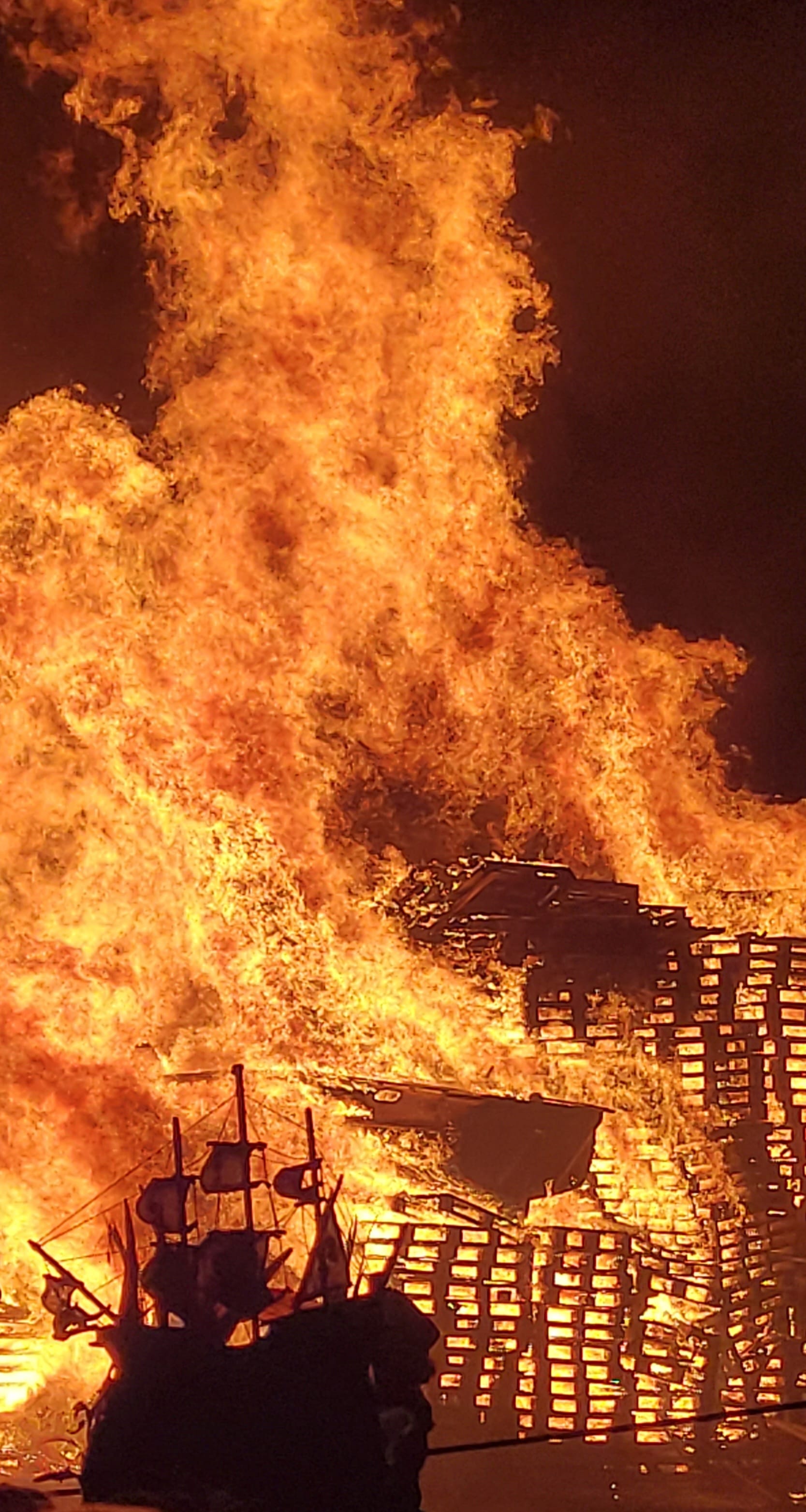 The French attacked us Young and old; Pillage and plunder their vile intent. Rye was razed where e’er they went. Ryers, angry but distraught. Rather than have their vessels caught. Set them alight by their own hand And watched them burning, off the Strand, Flames engulfing, higher, higher, The gallant vessels’ funeral pyre. In Rye today, there lingers on This proud act of those long gone. Yearly, Rye, aglow with name. As another vessel adds its name To the gallant list that’s gone before. Of those proud boats of days of yore. Flames engulfing, higher, higher The gallant vessel’s funeral pyre. And with the embers Rye remembers Jubilant, a thousand throats Ring out the cry: RYE BURNS ITS BOATS.