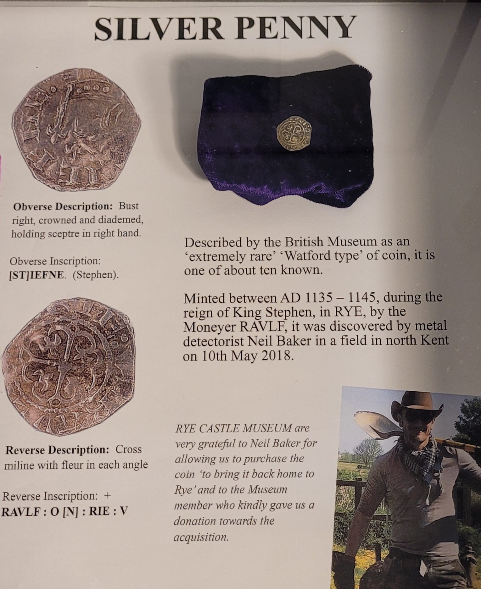 The tiny, thin coin was found by a metal detectorist Neil Baker in a Kent churchyard on May 10, 2018. He took it to the Portable Antiquities officer for Kent who sent it to the British Museum for authentication and evaluation. It was described by them as an extremely rare penny, one of only about 10 known. With the help of a donation from a Rye Museum member, the penny was acquired by the museum in 2019 and is now proudly displayed in a special British Museum coin cabinet in East Street. As Neil Baker put it, it is “back home to Rye”.