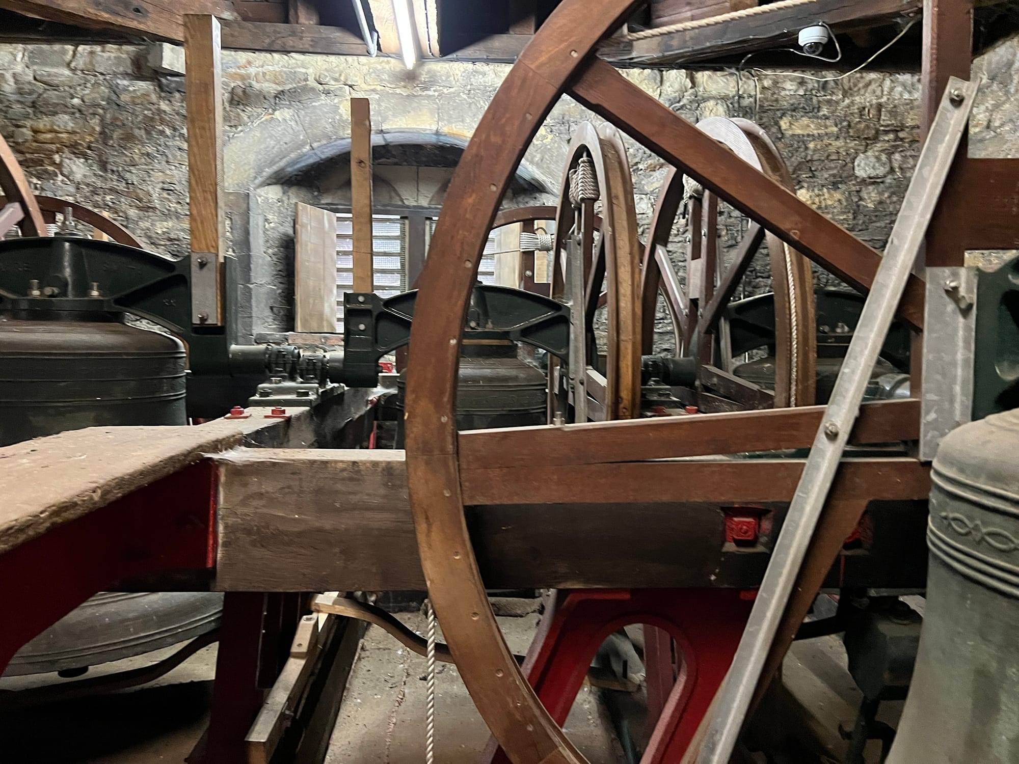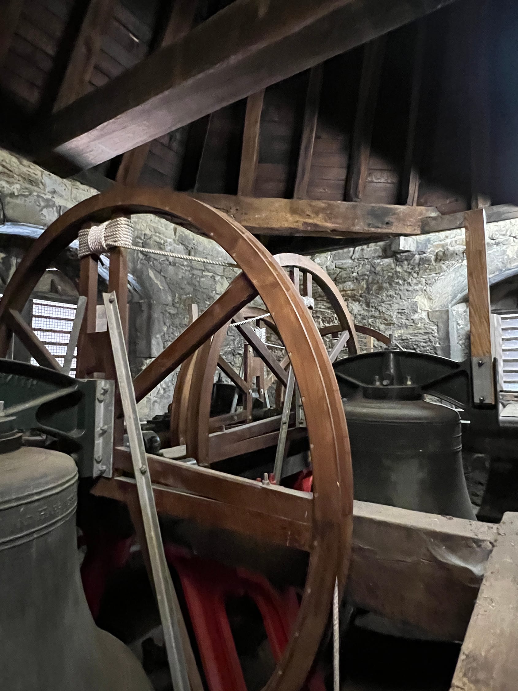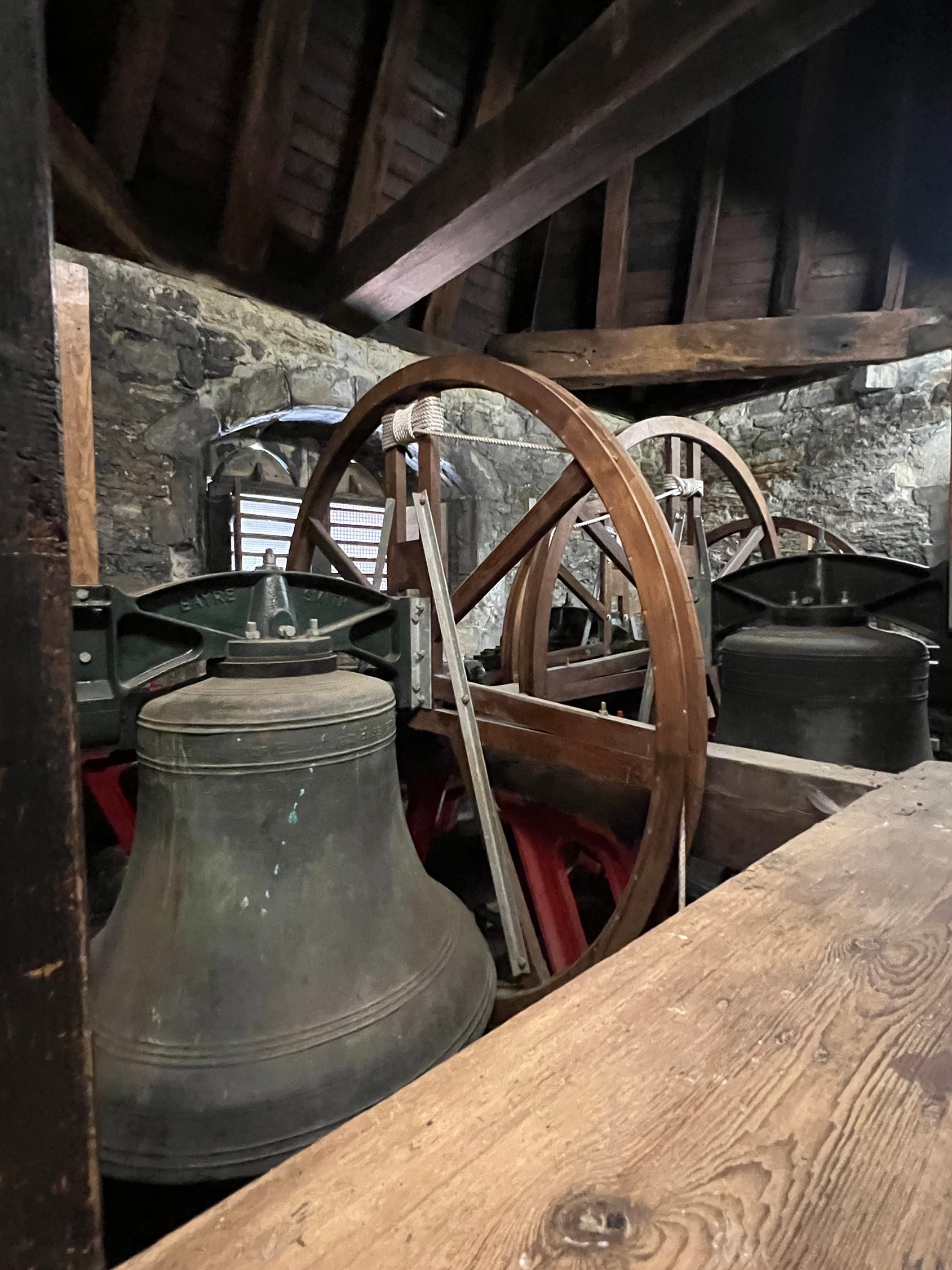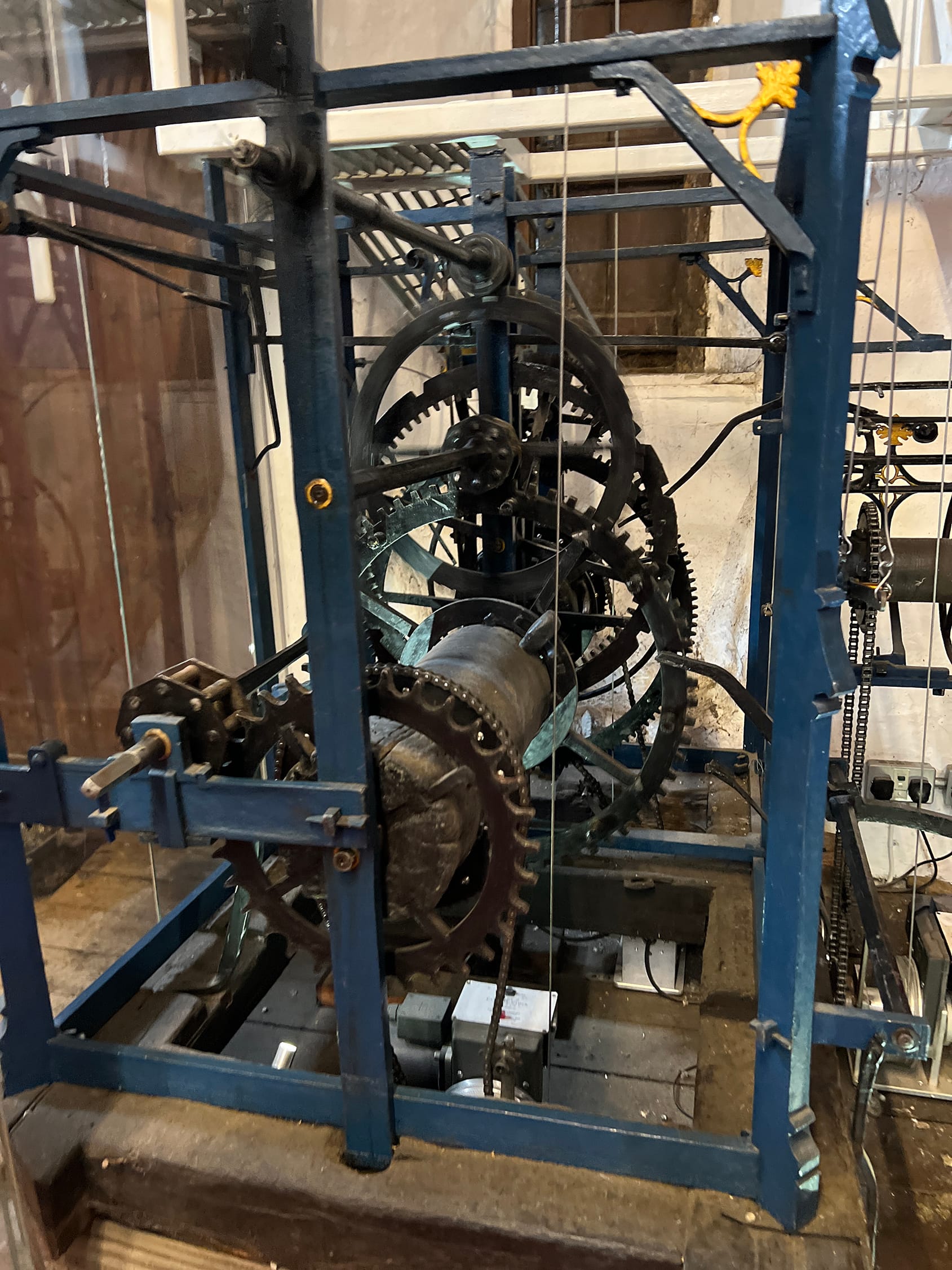 "The quarter train is newer and it is quite a lot smaller as it doesn’t require so much power as the bells for the quarter boys are so much smaller than the main clock bell. The reason the main strike needs such a big piece of machinery is that it has to lift a hammer heavy enough to get the full sound out of the bell and it has to do this quickly enough for the bells not to be too prolonged. A lot of power is needed in a very short period of time.