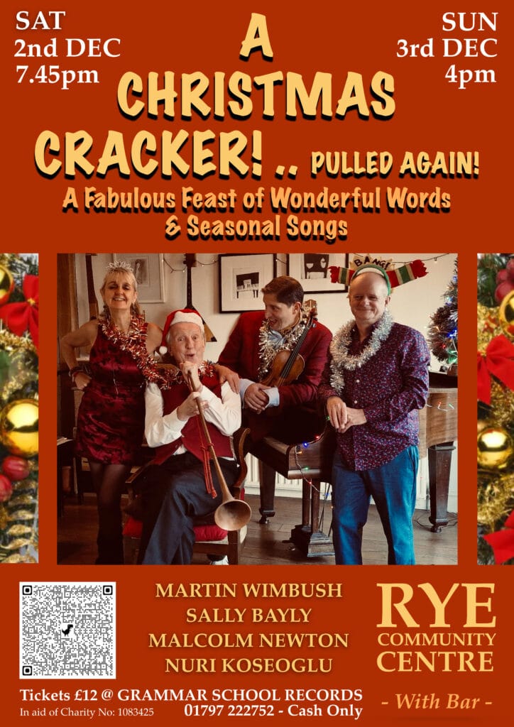 A Christmas Cracker – Pulled again Kick off your Christmas with this fab, fun, uplifting Christmas show! Saturday, December 2 7:45pm and Sunday, December 3 at 4pm. Festive songs from Sally, lovely Christmas readings and poems from Martin Wimbush, and lots more besides. Tickets £12 (cash only) from Grammar School Records. Profits in aid of Rye Community Centre. Musical direction by Malcolm Newton with guests on violin Nuri Köseoğlu.
