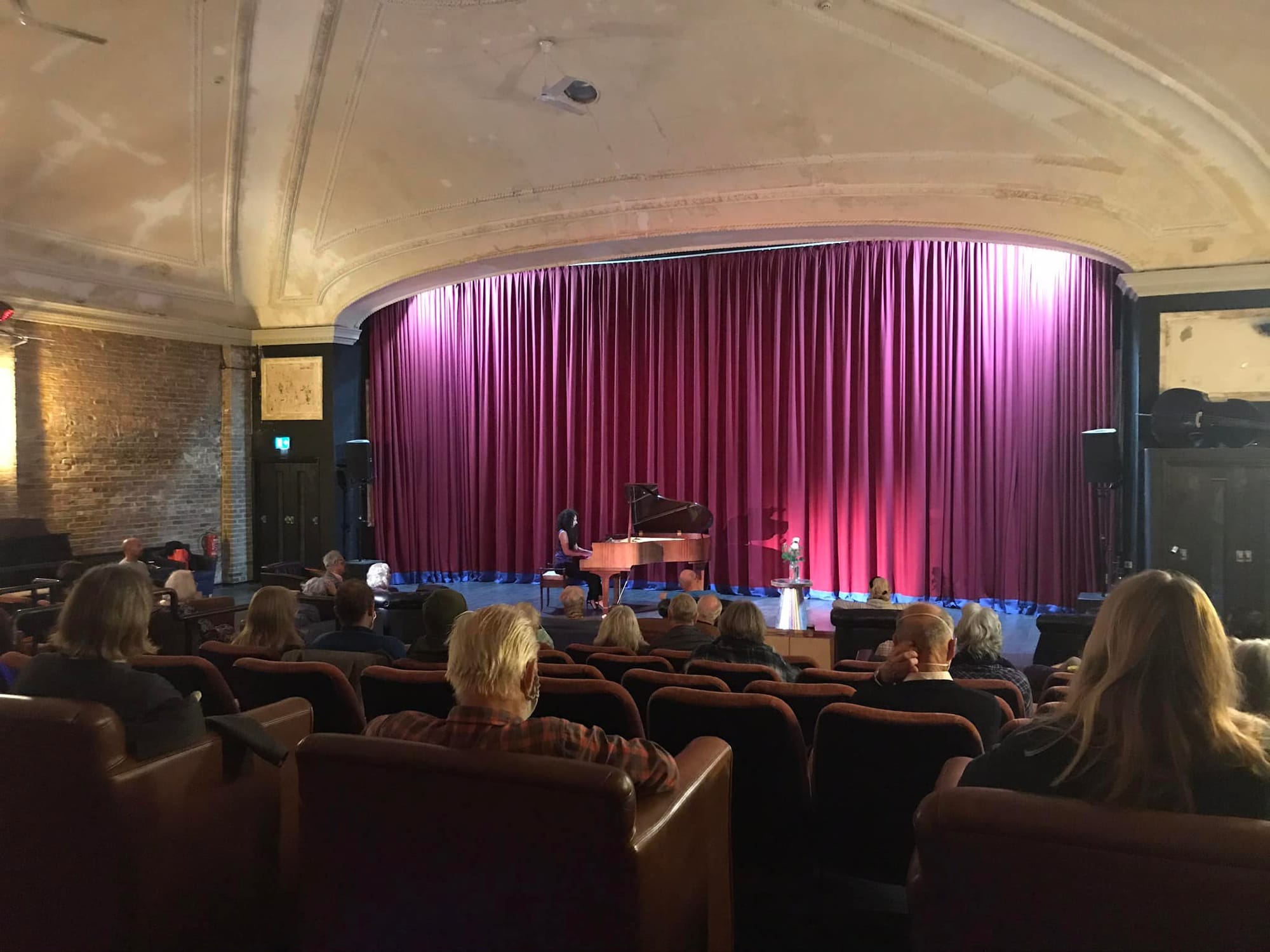The auditorium has a domed ceiling which gives it very good acoustics and the stripped walls and peeling paint, along with the red curtain across the screen and the bar at the back, give it a sense of faded glamour. When sitting at the front in the comfortable armchairs, you could almost be sitting in someone’s front room.