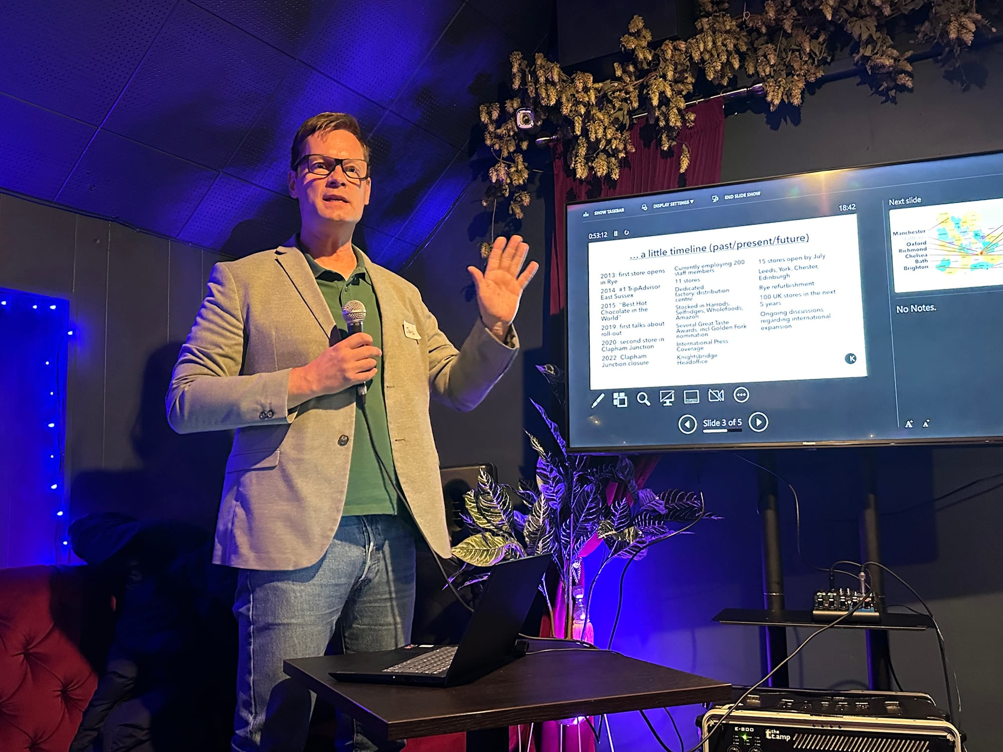 The highlight of the evening was the guest speaker – Jens Knoop - who shared the compelling story of his brand. His hot chocolate takeaway business Knoops began in Rye ten years ago and is growing at a phenomenal rate here in the UK, with ambitious plans to take it international in 2024. Local businesses were inspired by Jens’ modest and witty talk, and there were plenty of questions.