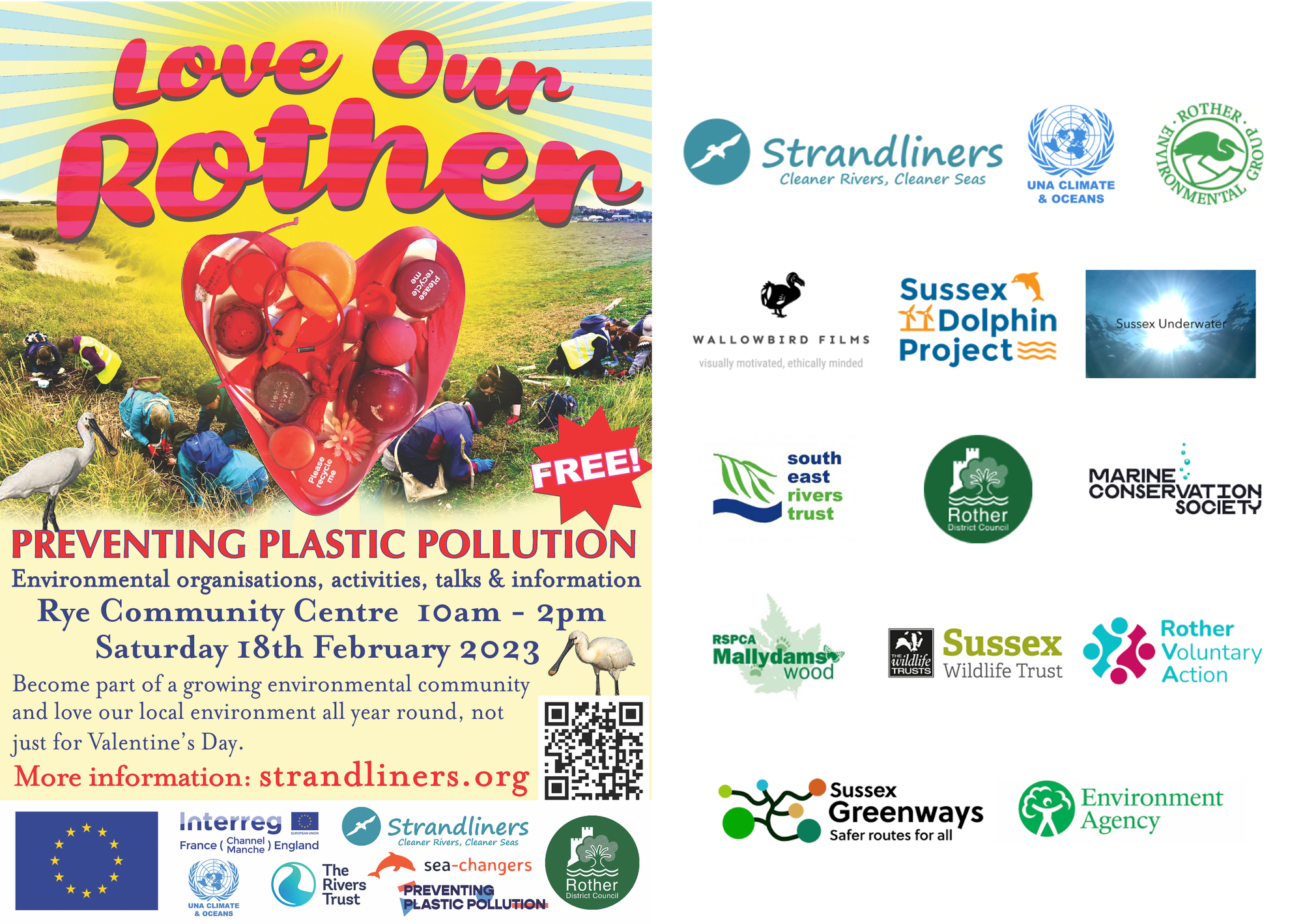 Strandliners would like to express its appreciation for all the organisers and enthusiastic volunteers that made the event possible, including UNA Climate and Oceans, Sussex Dolphin Project, South East Rivers Trust, Sussex Underwater, Marine Conservation Society, Sussex Wildlife Trust, Rother District Council, Environment Agency, Rother Voluntary Action, Rother Environmental Group, Sussex Greenways, Rye Community Garden, RSPCA Mallydams Wood Wildlife Rehabilitation and Education Centre and the Rother Green Party.