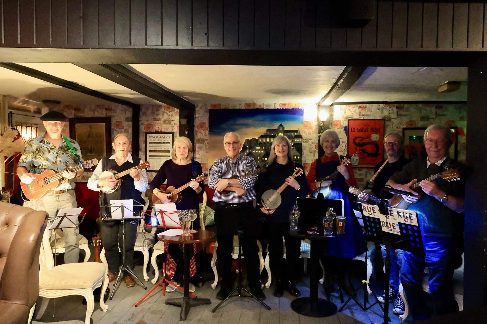 Rye Ukulele Experiment performed at the Queen’s Head on Tuesday February 25 as part of the Rye Bay Scallop week. They played a mix of uplifting sea ballads, fishy songs, shanties with rolling choruses, a drunken sailor’s lament and other rousing songs. They are a friendly bunch with lots of enthusiasm and are always keen to welcome new players from beginner, through improver to expert. They always have a spare Uke if anyone just wants a go, from sopranos, through tenors, to banjoleles and kazoo players - they can play almost everything: they are the Rye Ukulele Experiment.