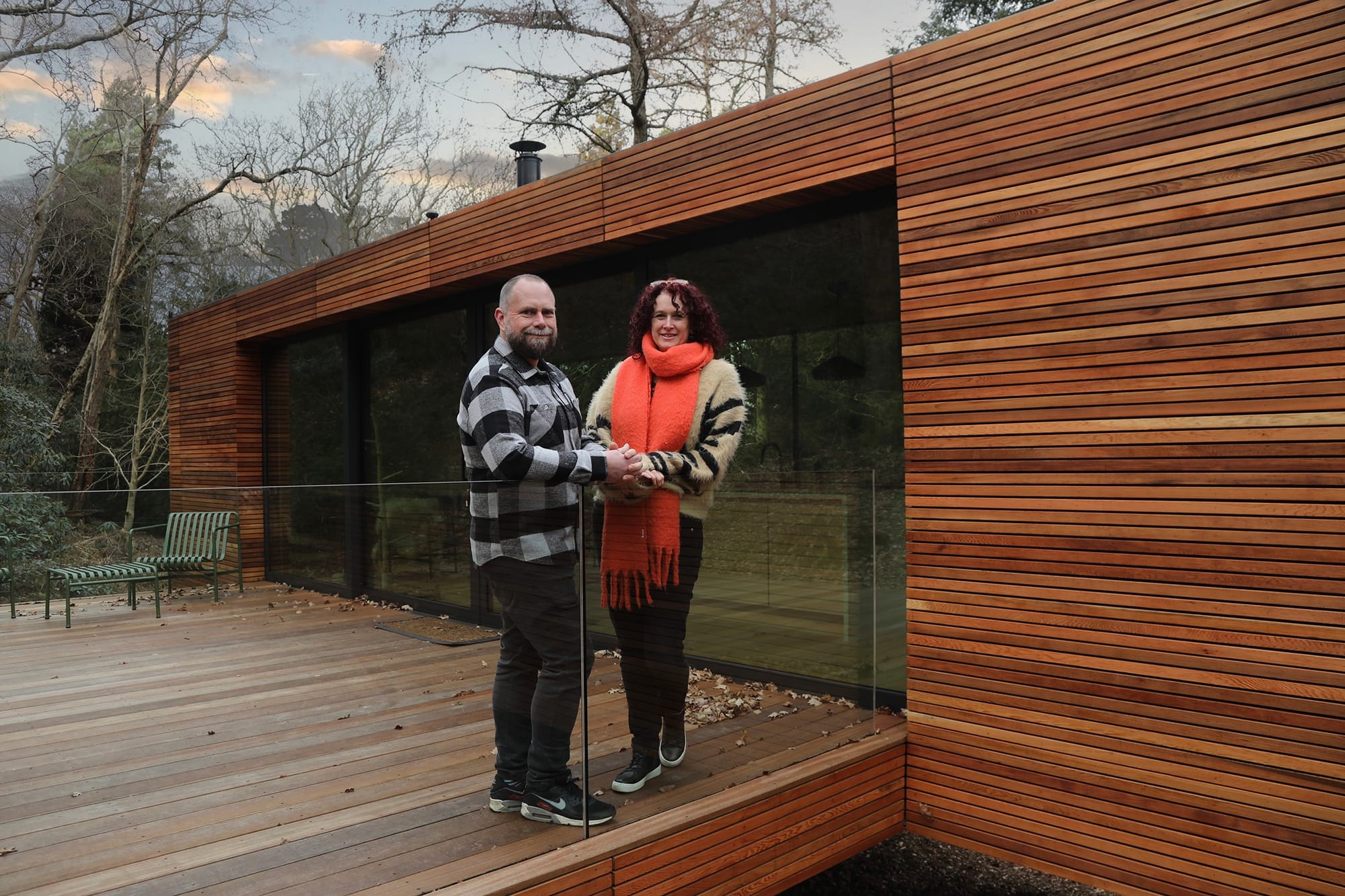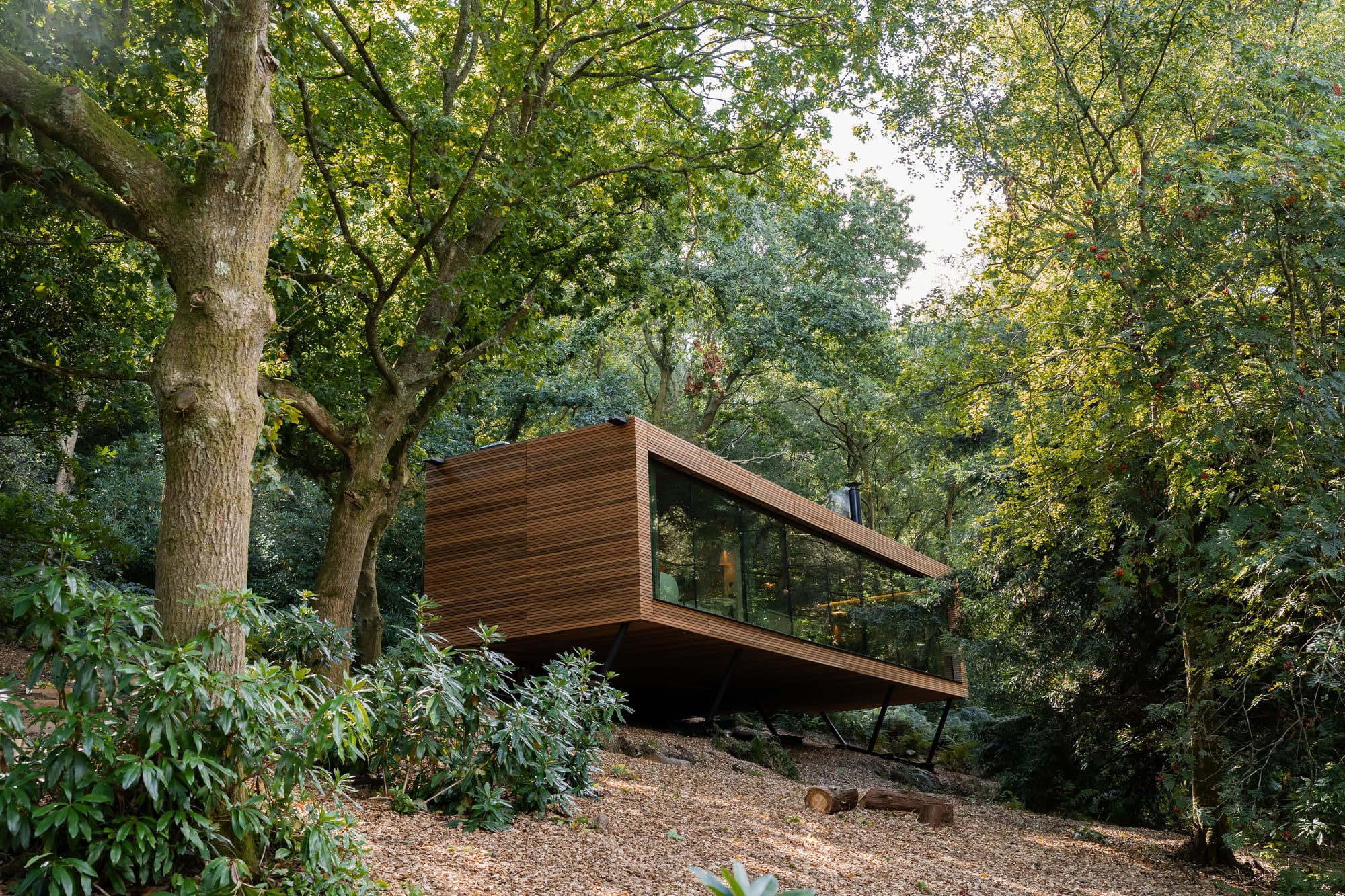 Looking Glass Lodge began its story four years ago. It is the brainchild of Lindsey and Rik who began the project in 2018. The Lodge seems to welcome you as you walk into the glade. It is one open-plan space with walls of smart glass that run the entire length of the building. The glass, which darkens electronically, was a requirement of the planning consent to prevent light-leakage in the woodland environment.