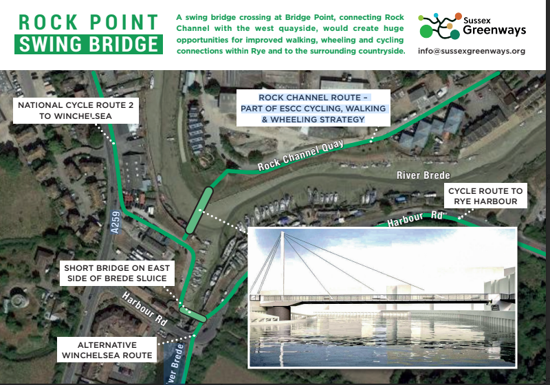 This route could be extended across the mouth of the Tillingham at Rock Point – not as a road bridge, but as a pedestrian, disabled and cycling bridge. A swing bridge wouldn’t hinder boat traffic to Strand Quay and would support the Rye Neighbourhood Plan by improving the town as a visitor destination, promoting green tourism, encouraging connectivity and sustainable transport, and fostering community health and wellbeing. It would also support the development of the King Charles III Coastal path – and the proposed housing on Rock Channel could provide funding.