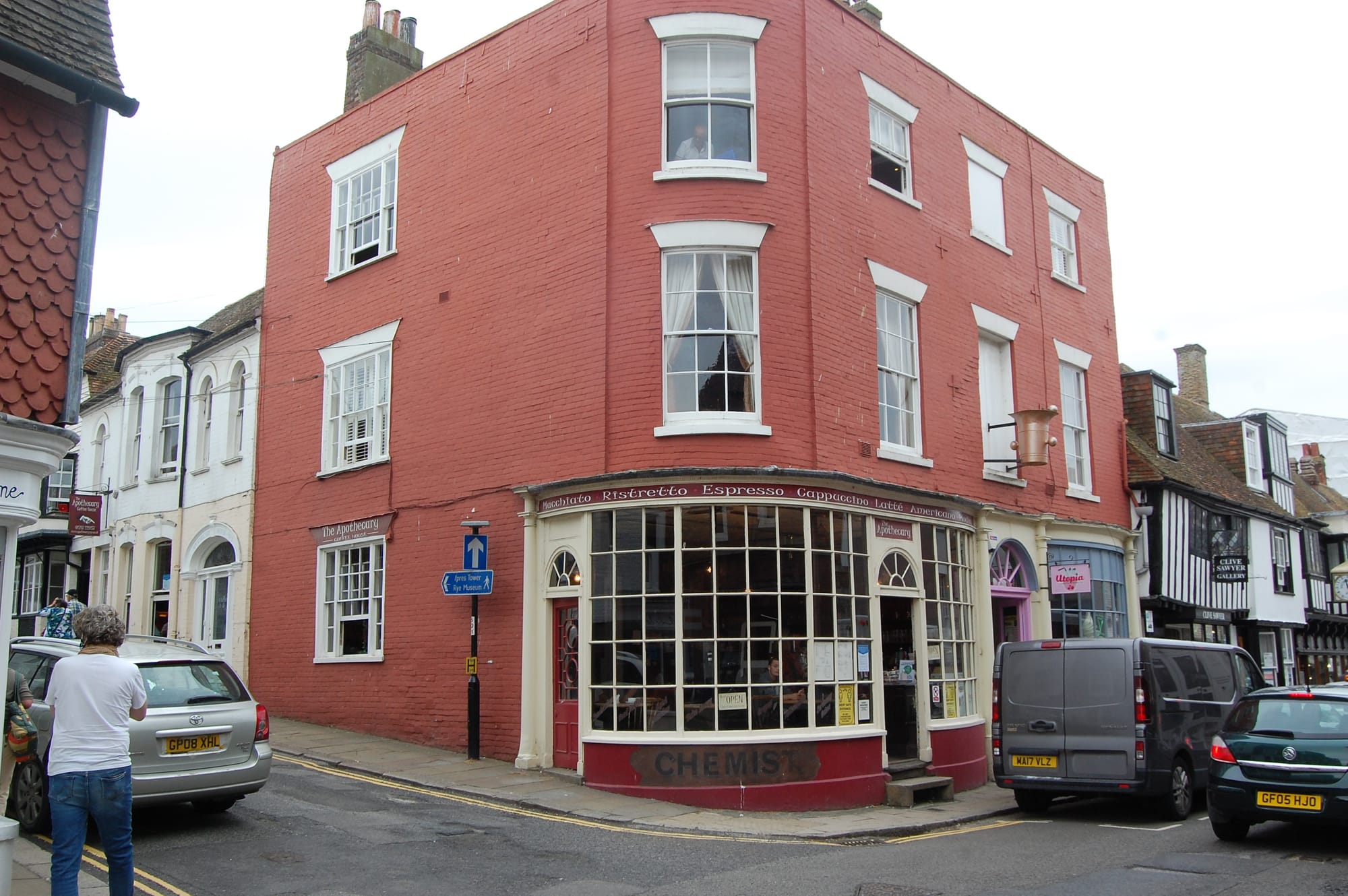 Across East Street was the Old Apothecary chemists, Rye Goldsmiths and an off licence nearby. Next was Ashbee's butchers, and Bennett’s men’s outfitters. Across Lion Street was the George Hotel, John Dennis ironmongers, and Roseanne dress shop. Somewhere near was a Victoria Wine shop, then Adin Coates ladies undies and haberdashery, Miller and Macer's delicatessen (now Nationwide), and the Hastings and Thanet Building Society.