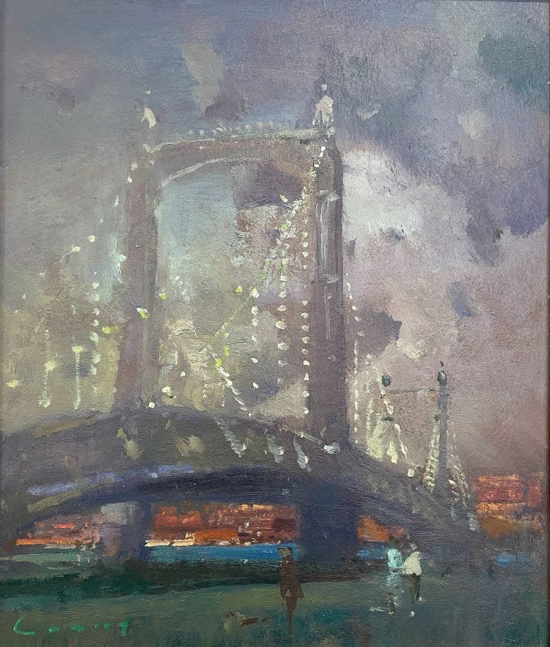Artists in focus include Fred Cuming (painting shown, Albert Bridge, 1991, oil on board), Emma Turpin, (Eve light, oil on board), Jenny Pockley (Cloudburst-oil on copper) Colin Slee (main photo)