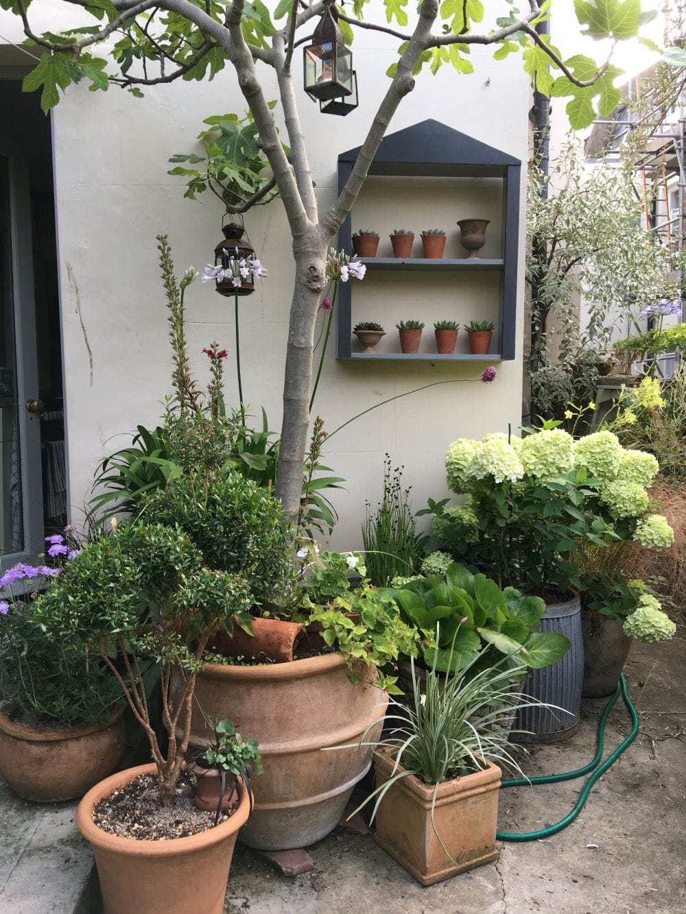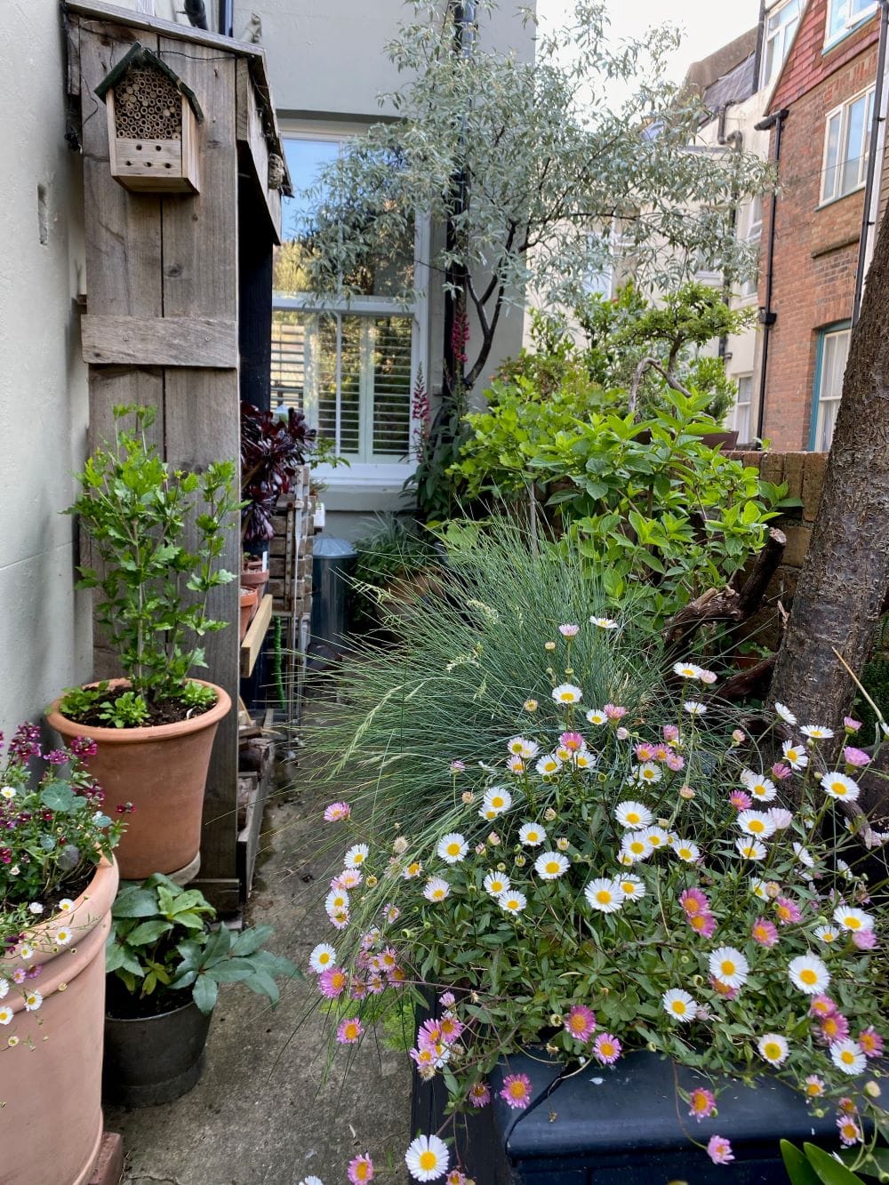 My courtyard garden in Hastings plays host to a mix of containers and plants of varying shapes, sizes and materials. From the tiniest bonsai tree to a rather large olive and all sizes in between. My plants grow in hand-made, found, new and repurposed planters. Personally, I like to use a mix of oak, painted wood, vintage galvanised tubs and terracotta.