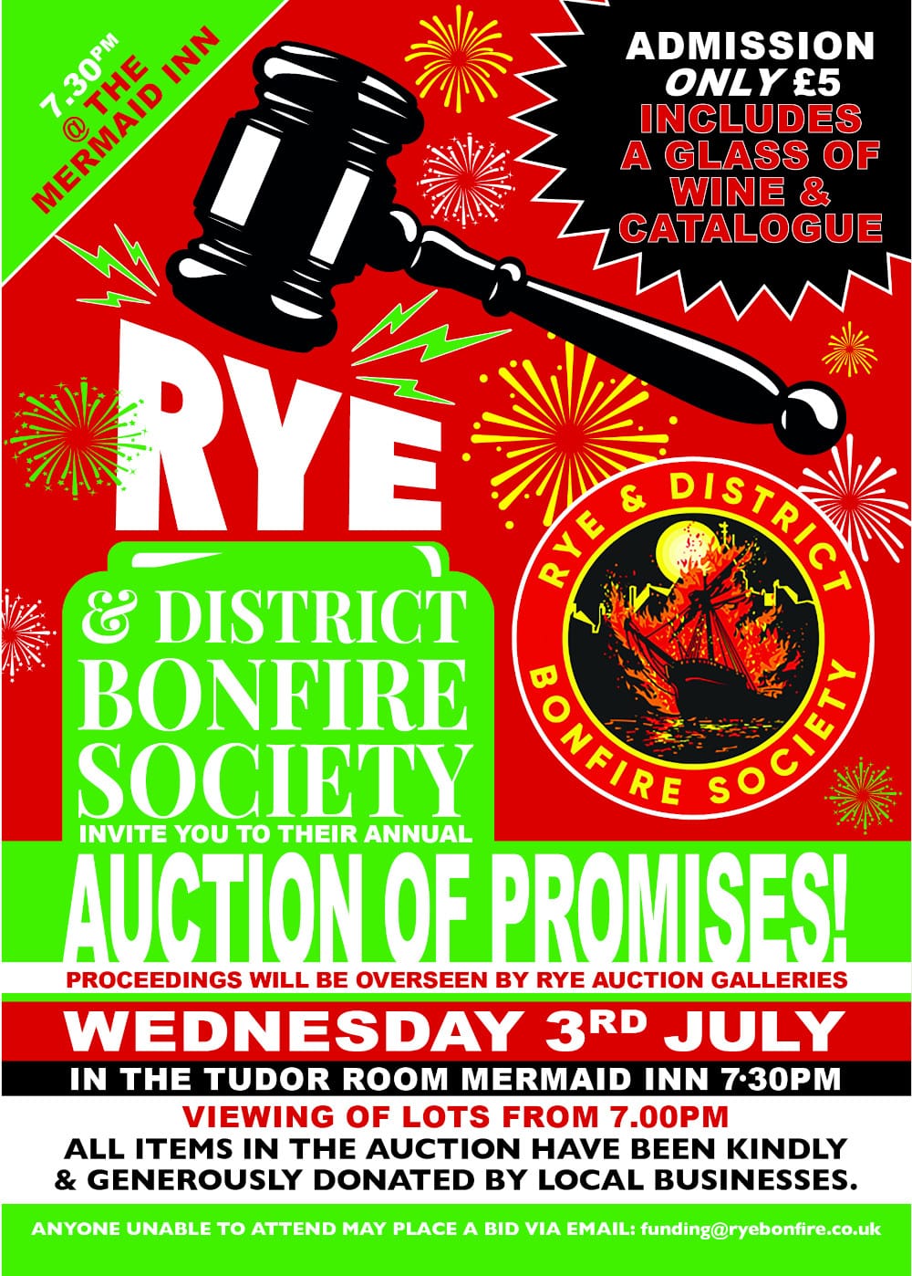 The annual Auction of Promises will take place in the Tudor Room at the Mermaid Inn on Wednesday July 3, doors will open for viewing at 7pm with the bidding beginning at 7:30pm. This is Rye Bonfire Society’s biggest fundraising event of the year.