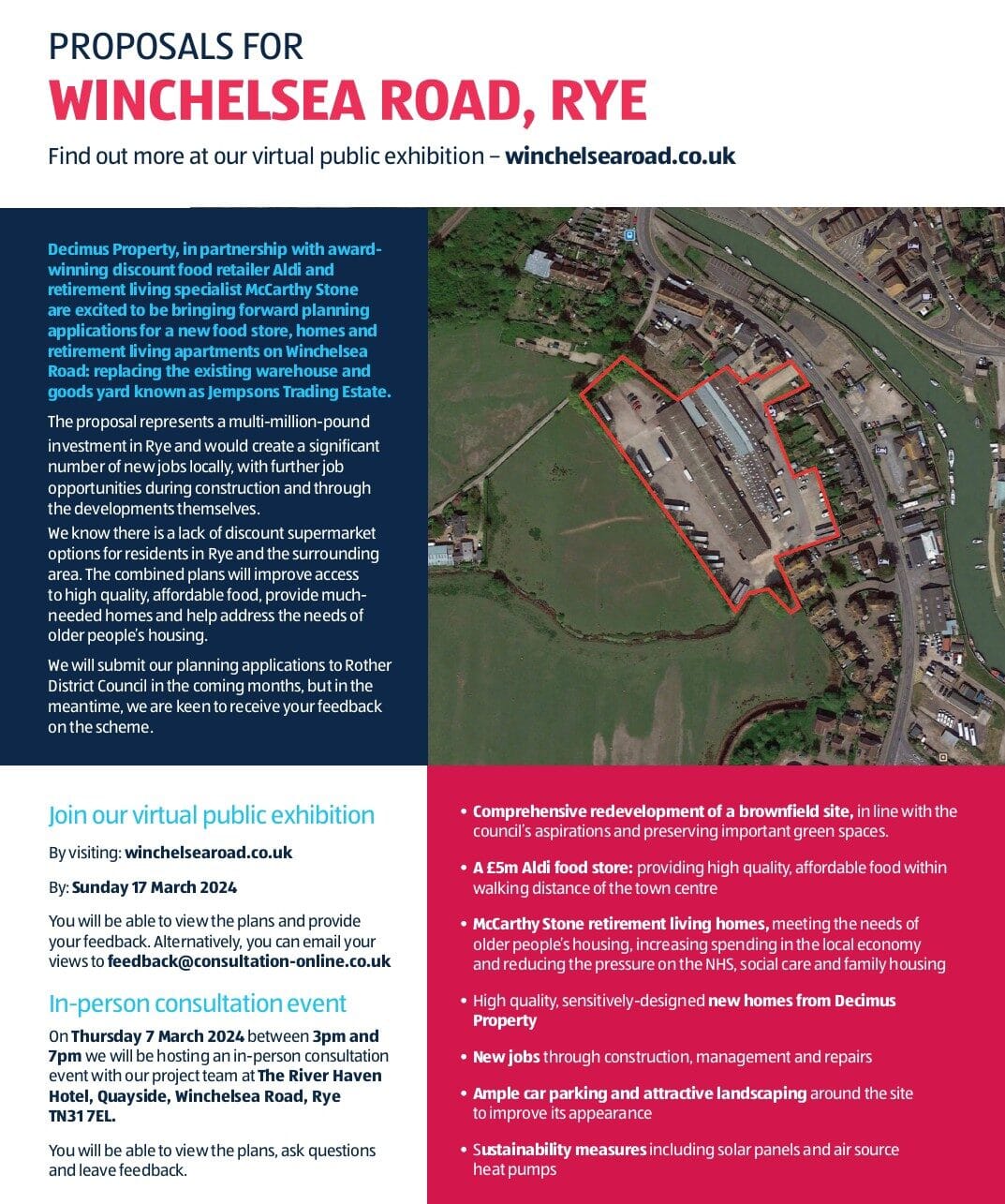 But no, Cavendish Consulting on behalf of Decimus, the Tunbridge Wells based developer of the Winchelsea Road Aldi / McCarthy & Stone proposed site, has organised an in-person public consultation / exhibition event on Thursday, March 7. All the details are in this flyer and in the image below, but the open meeting is from 3pm - 7pm at the River Haven Hotel in Rye (close to the entrance to the proposed development} and is your opportunity to put your views forward, ask questions and gather information.