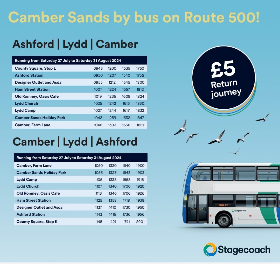 Stagecoach South East have just announced the new 500 beach bus service which will start on July 27 running for 5 weeks until the end of August to coincide with the school holidays and is available four times a day with the last bus leaving Camber at 7.00pm. The £5 return fare is exclusive to this service and there are discounts available. A family day ticket will be available for £17.10 covering all Stagecoach bus services in the region for groups of up to 5 people with no more than 2 adults. Concession passes will also be valid on the service. For more information go to www.stagecoachbus.com
