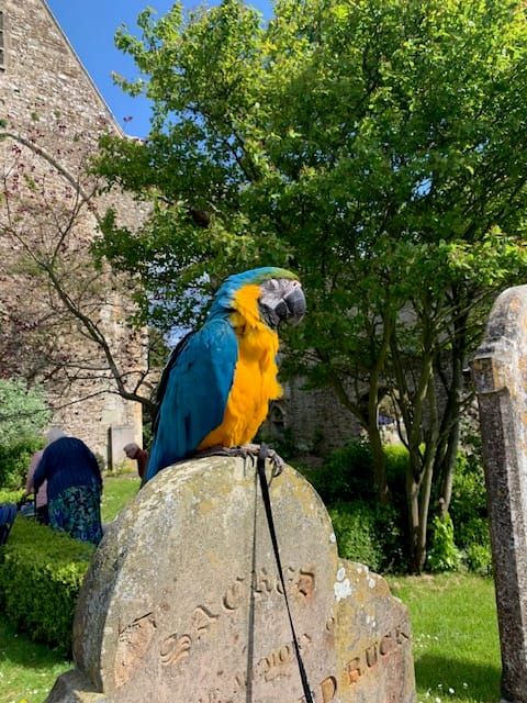 The star of the show was Bella the beautiful blue parrot who posed for photos perched on a gravestone and flapped her wings when any of the dogs became too interested. “She’s a bit of a diva and loves all the attention,” says owner Barry, down from London and spending time on his boat in Rye. And how do you follow such a charming, friendly, and very Winchelsea service? Tea and cakes inside the church for everyone, including the animals, and a chance to admire the brilliant Flower Festival displays, which rival the Chelsea Flower Show for creativity, imagination…and a bit of eccentricity.