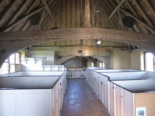 Around 1200, a very basic building arose made from the traditional materials of lathe and plaster, and probably lime plastered or lime washed inside and out. This early church survived, almost miraculously intact, into the 18th century when bricks were used to enclose the original building and red clay tiles covered the roof. At the same time a new brick foundation was added.