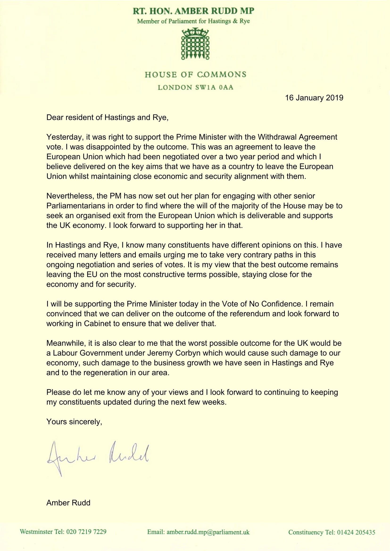 Shortly after the defeat of the government's Brexit bill last Tuesday, January 15, Hastings and Rye MP Amber Rudd issued an open letter to all her constituents, which we reproduce below.