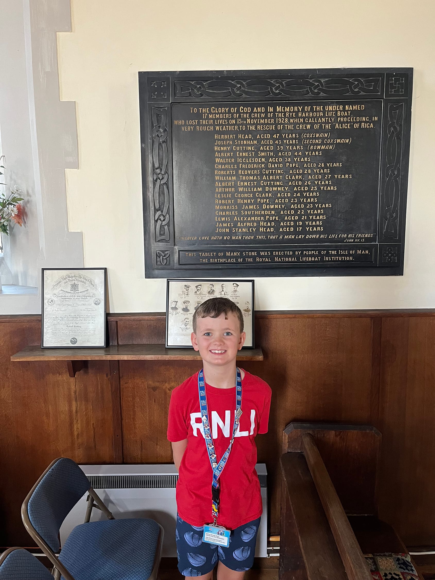 On Wednesday, August 29 Barnaby Blyth visited the lifeboat station in Rye Harbour and then the Church of the Holy Spirit at Rye Harbour to see the memorial tablet honouring the lives of the seventeen crew who lost their lives in 1928. He also was thrilled to see the churchyard memorial and asked lots of very interesting questions. He brought with him his father, Railton, and his grandparents who also were keen RNLI supporters.