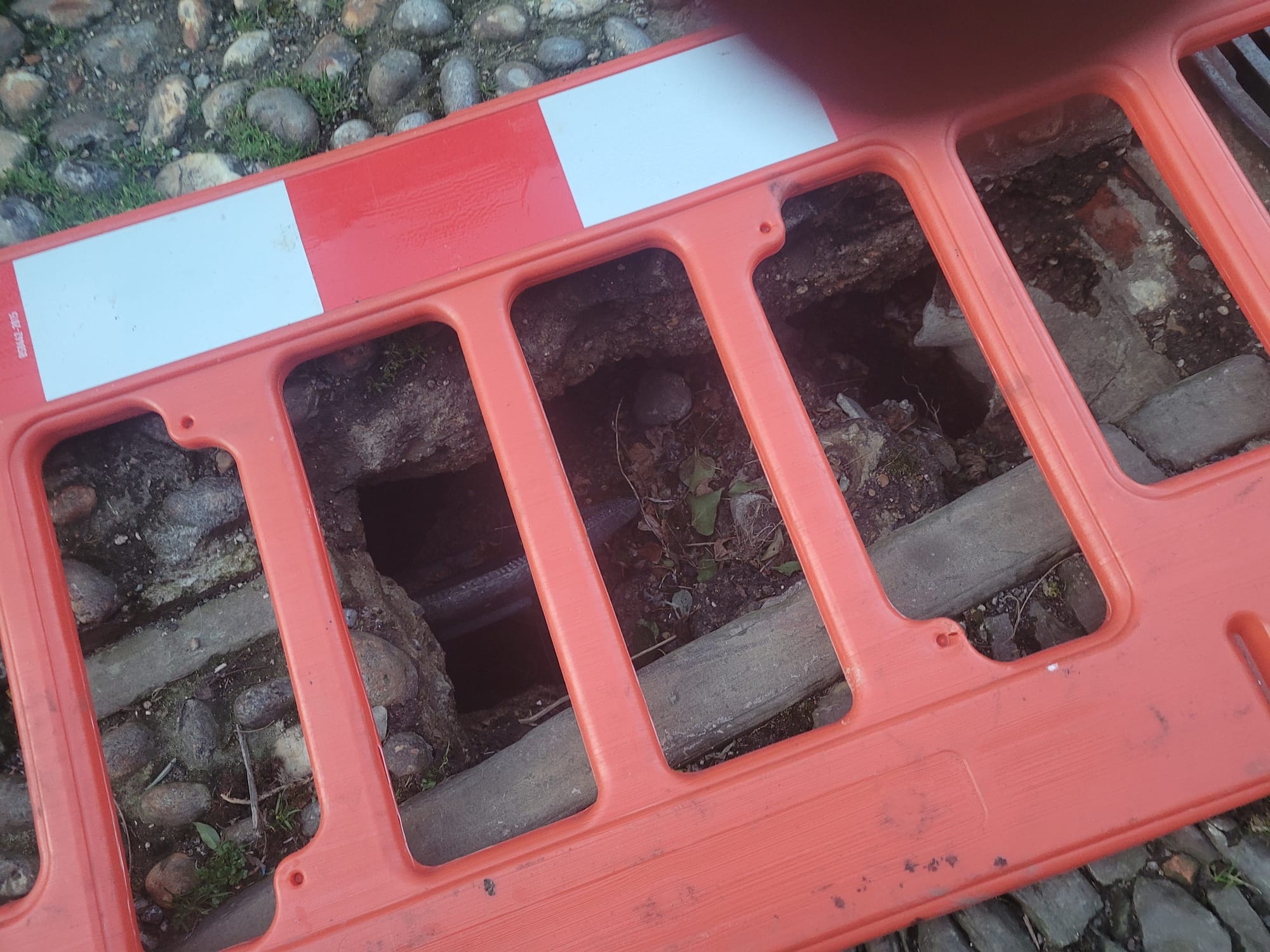 Richard Martin continues: “the barriers have blown down in the recent storm and every passing lorry causes more damage. The dust cart actually had its wheels in it last Monday. Obviously this is a very dangerous hazard in an already steeply cobbled street with many cracked and broken paving slabs. We have had to call an ambulance regularly for visitors who have tripped. It is an accident waiting to happen, but by then it will be too late.”