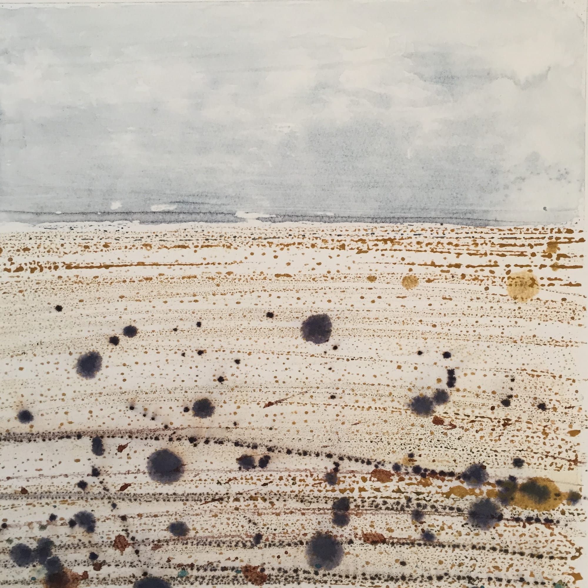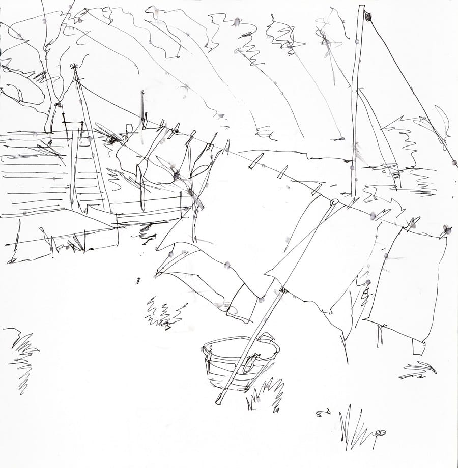 "We live in Rye Harbour, the garden forms part of the Rye Harbour Nature Reserve. I was sitting on the garden table in October last year, drawing the washing line, bit of a breeze, keeping my focus on the blowing washing and not on the paper, it started to rain lightly which account for the little blotches on the paper. I stopped the drawing then. The rain blotches add interest.