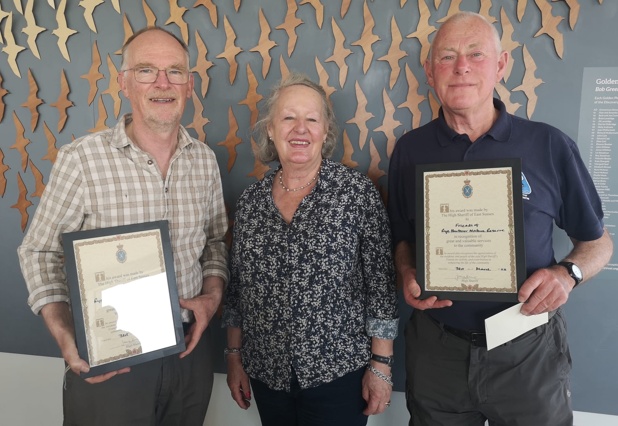 “Earlier this year, Chris Corrigan, interim CEO of Sussex Wildlife Trust met the former high sheriff of Sussex, Jane King, for a tour of the reserve. In June, Jane returned to meet Sussex Wildlife Trust staff and friends’ trustees at Rye Harbour: she was so impressed that she intends to nominate the friends for the King’s award for voluntary service (KAV). This is the highest award given to volunteer groups across the UK. It is the equivalent of an MBE and it is awarded for life. The process of selection is a long one. Nominations are made before September 2023 and then between December 2023 and May 2024 assessment takes place. Those who have been successfully nominated are announced in November 2024 and will then receive the KAV award. The assessment panel is made of those involved in both the business and charity sectors. We will have to wait until next year to discover if our nomination is successful but the very fact that the friends have been nominated at all is a high honour and says much about the work undertaken by us on behalf of the reserve. Jane also presented us with a certificate and a donation of £250.”