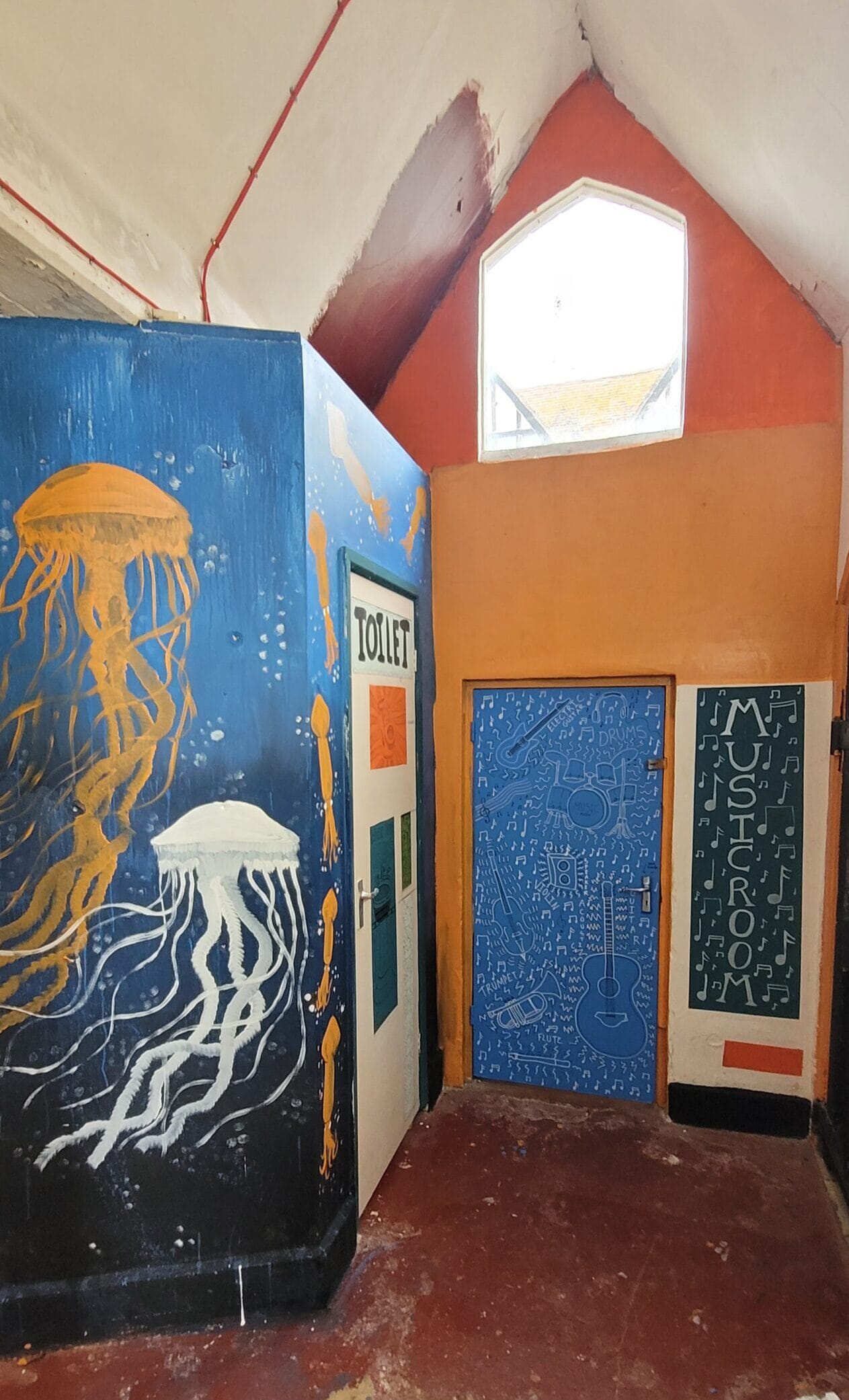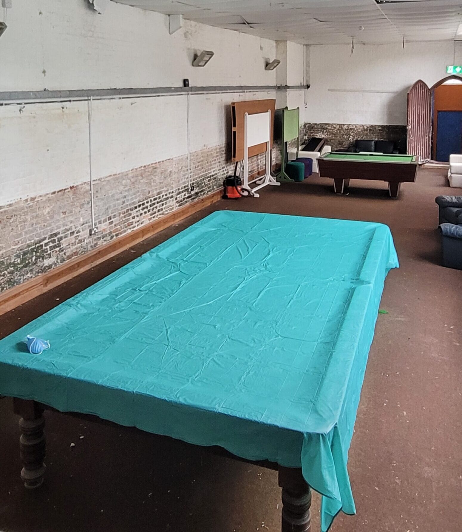 One of the rooms contains a full-size snooker table, newly covered by Peter from Hubble Sports, dwarfed by the size of the room, and a pool table, and will be used as a games room. The walls need painting, and the suspended ceiling repaired. The other large room also needs to be painted and is spacious enough to be used for indoor sports. Some of the toilet doors and walls have been painted with fun and bright images and patterns by Sophie’s daughter, Kayla.
