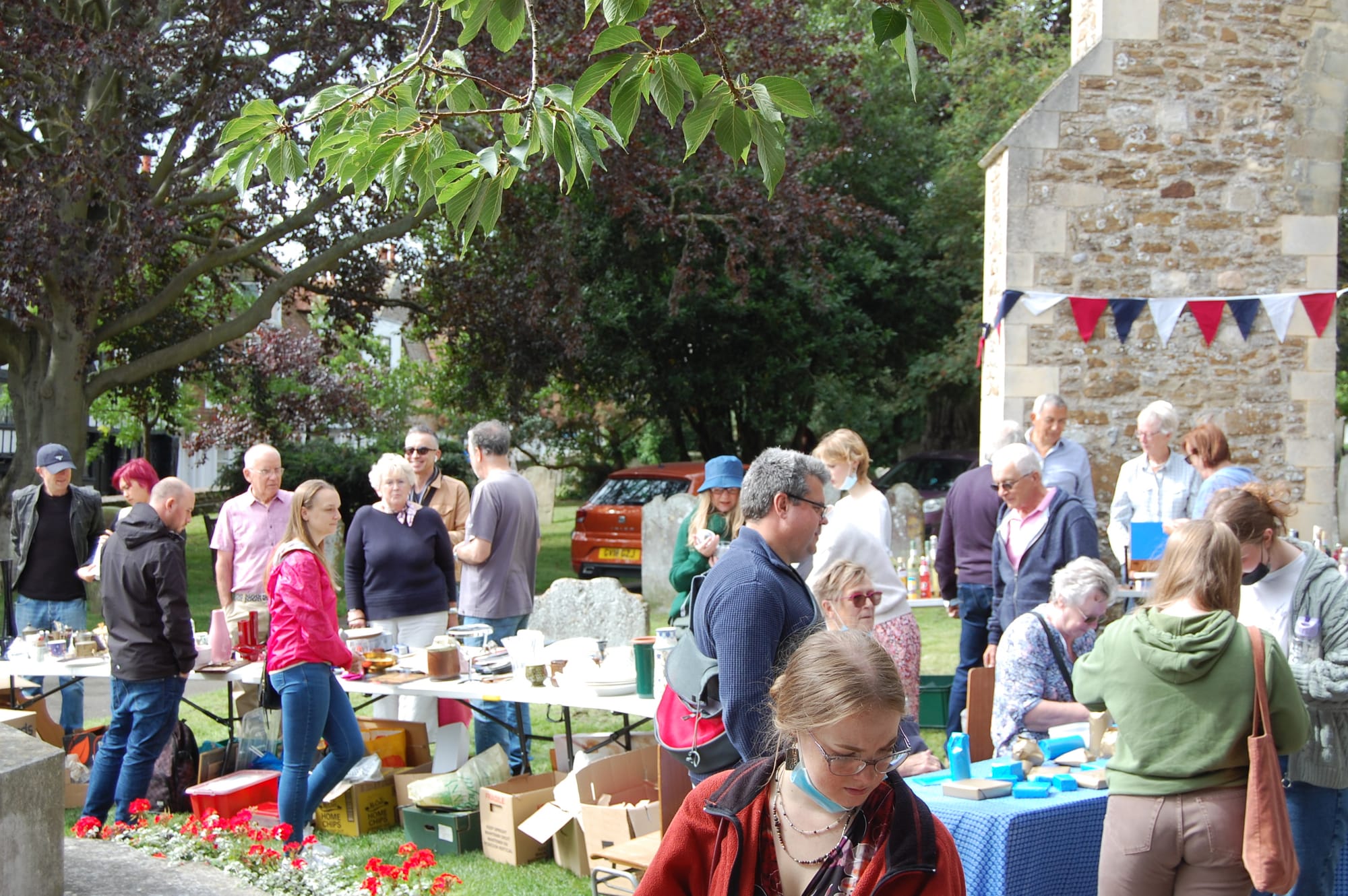 The annual fund raising sale took place this year outside in the churchyard by the war memorial. There were a reduced number of stalls compared with a normal year. Among old favourites were the cake and soft toy stalls interspersed with bric-a-brac and prize-incentivised guessing games to win a bottle of wine or some concealed scent or perfume.