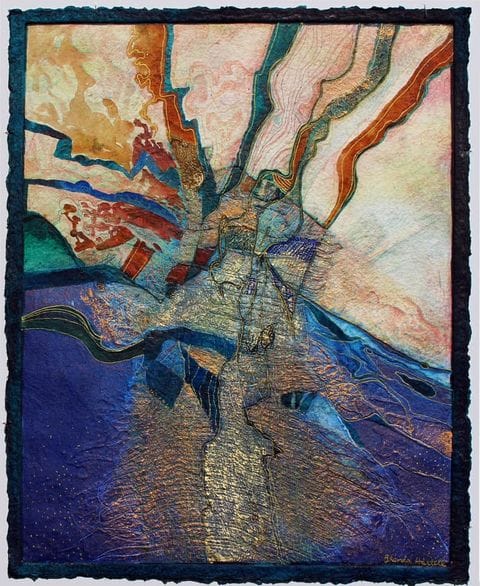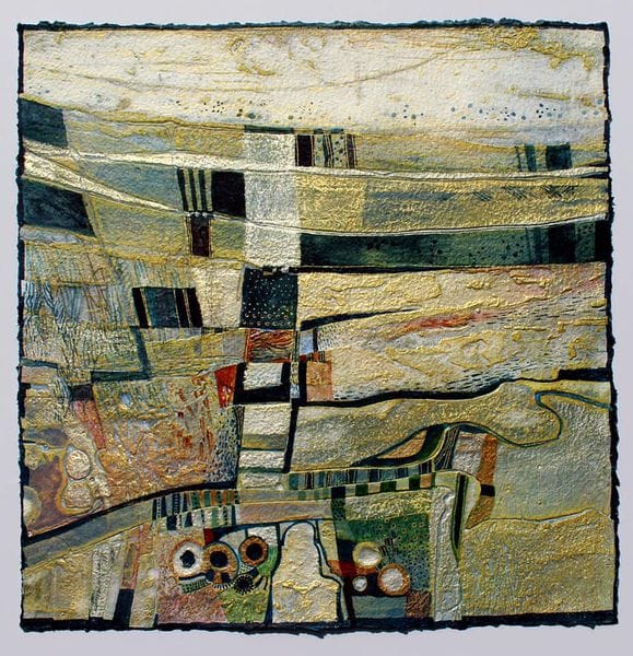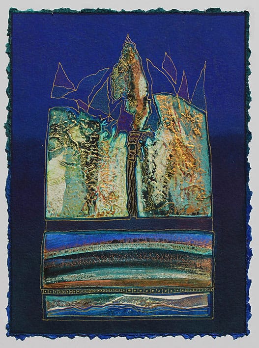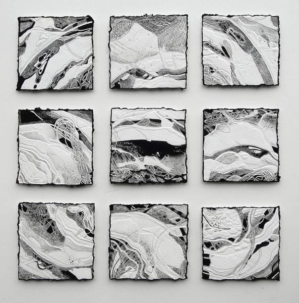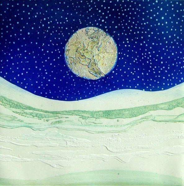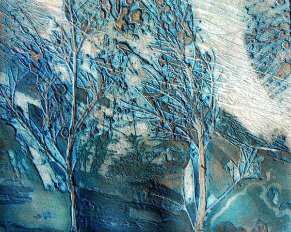 Her speciality is collagraph and etching, and more recently her embossed paintings. Natural growth mineral forms and erosion are her inspiration, and she uses gold and silver leaf in her richly textured, glowing works.