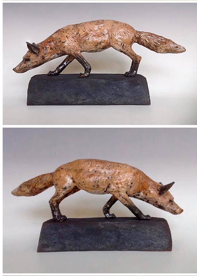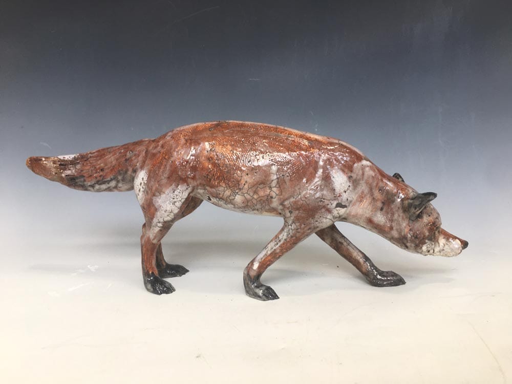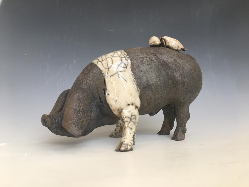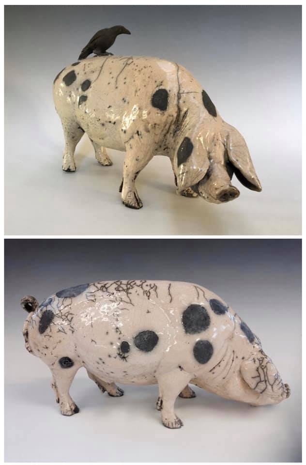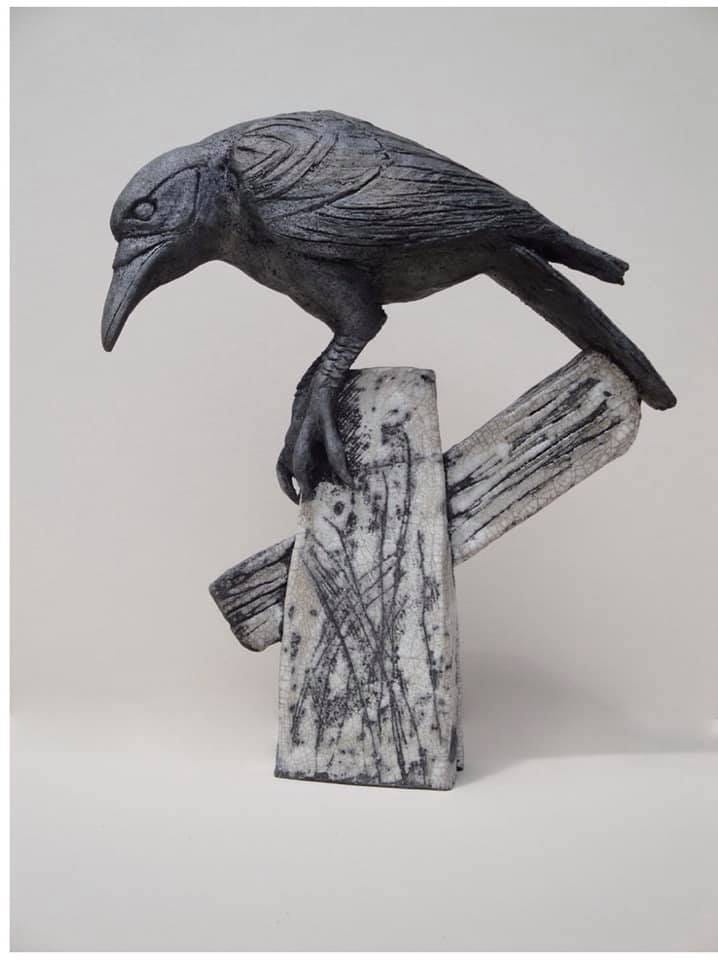 The work is slab built with modelled additions and firing techniques used are Raku with post firing reduction and oxidized stoneware.