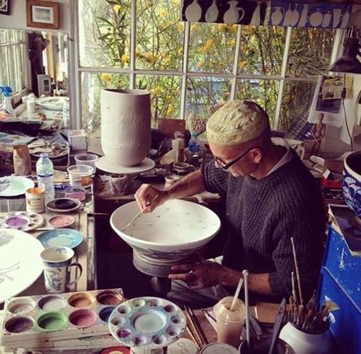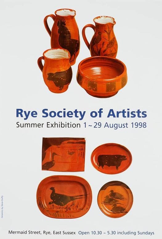 Steve Duffy is known for wheel thrown, hand painted ceramics and linocuts. He also paints.