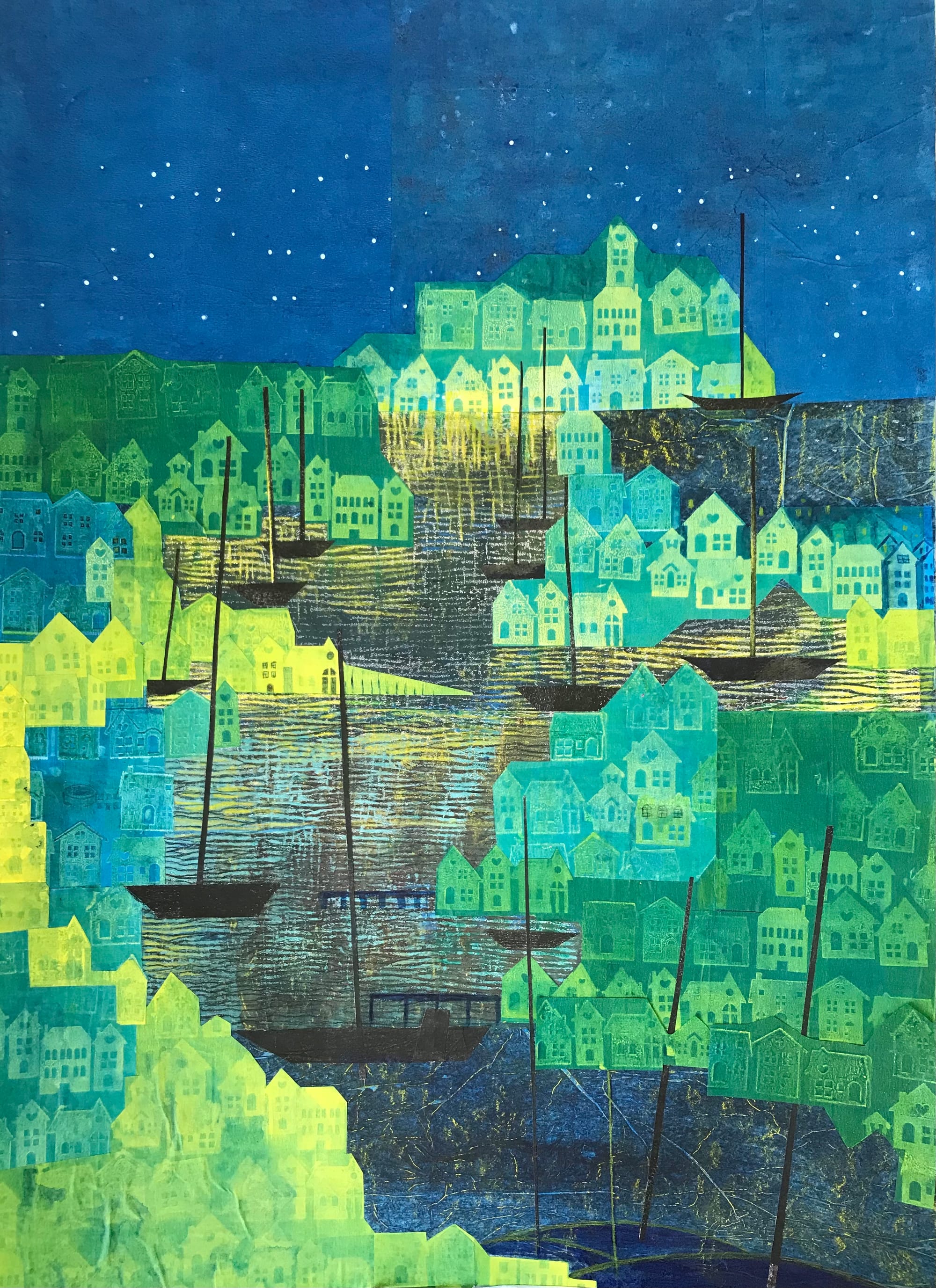 trained at Goldsmiths in London and New South Wales University, completing a masters in printmaking. Her work is found in universities, museums and private collections here and in Australia. Some recent mixed media views of Rye are currently on show at the station, as part of an exhibition of poetry by Rye Harbour writers to which she is also belongs.