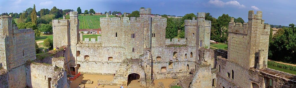 The castle was bought Sir Thomas Webster in 1722, and it was held by his descendants for more than 100 years. Contemporary pictures show it as an ivy decked romantic ruin, and it became popular destination because of the revival of interest in Gothic architecture. Sir Godfrey Webster in 1815 had decided to sell Bodiam, which he finally did in 1829, along with 24 acres of land. The buyer was Mad Jack Fuller, squire of Brightling, member of parliament and well-known builder of follies. It is generally believed that the reason he bought it was to save it from demolition and the reuse of its stone. The castle with 24 acres was again sold, in 1849, when George Cubitt, first Lord Ashcombe, paid Fuller’s grandson £5,000. Following Fuller’s lead, he worked on renovation the castle and commissioned its first full survey in 1864. He was responsible for restoring the almost collapsed southwest tower. By then the castle was covered in ivy, which was left for its decorative looks, and trees growing unchecked in the courtyard were left in place. The fashion then was for such places to be picturesque.