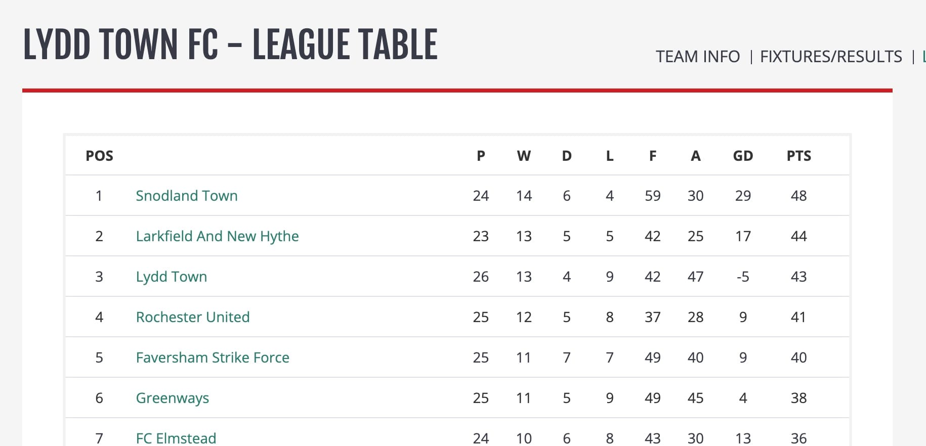 Their latest home game against Rochester United saw striker Luke Burdon score a double in a 2-1 victory that take the ‘Lydders’ into third place in the league table, two points above Rochester and just a point behind second-placed Larkfield and New Hythe.