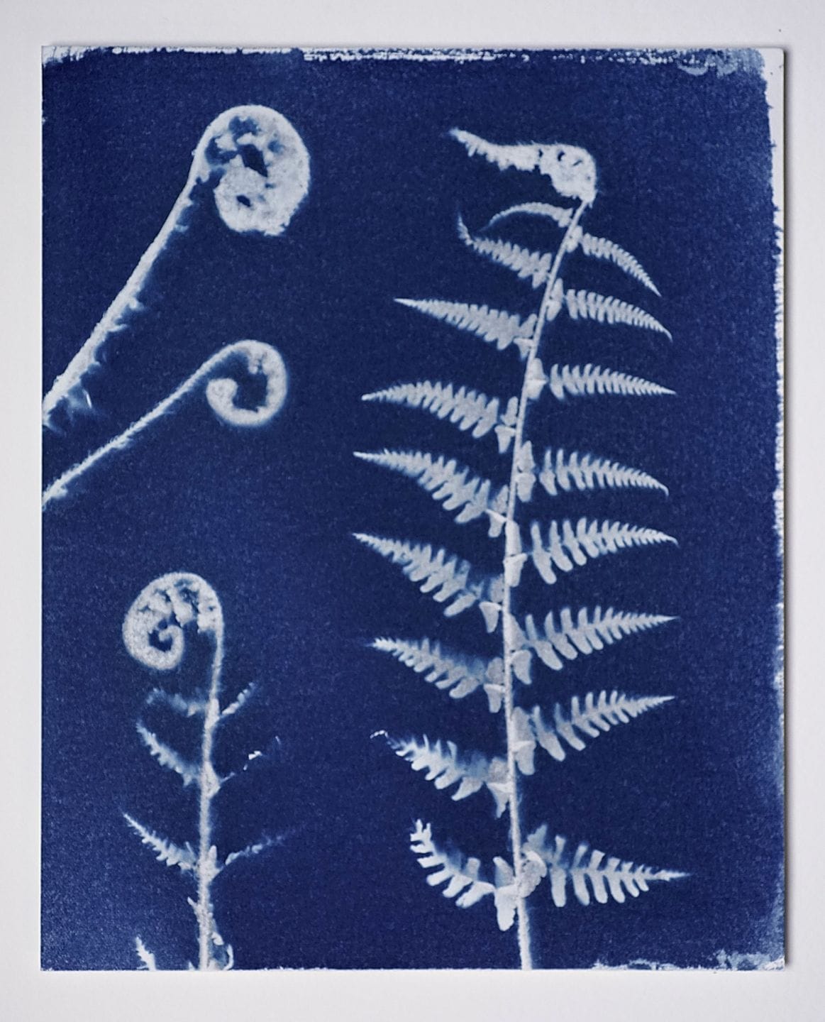 One of my current projects is creating cyanotypes of flowers on the Rye Harbour Nature Reserve. It involves coating watercolour paper in a light sensitive emulsion, placing flowers, such as cow parsley, on the paper, and exposing that to the sun to make a shadowgram. Then I rinse the unexposed emulsion away, leaving a white shadow of the plant on a blue background.