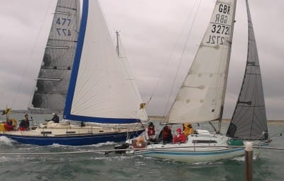 Rounding the mark, we chased Roxanne to the Rock Channel Marine Buoy off Winchelsea Beach. Were we gaining on her? Yes perhaps a bit and then disaster struck. While winching in the genoa (the sail), the sheet (the rope that controls the sail) became jammed in the winch and, in order to avoid losing boat speed, we had to carry on past the mark losing precious time until the jam was cleared.