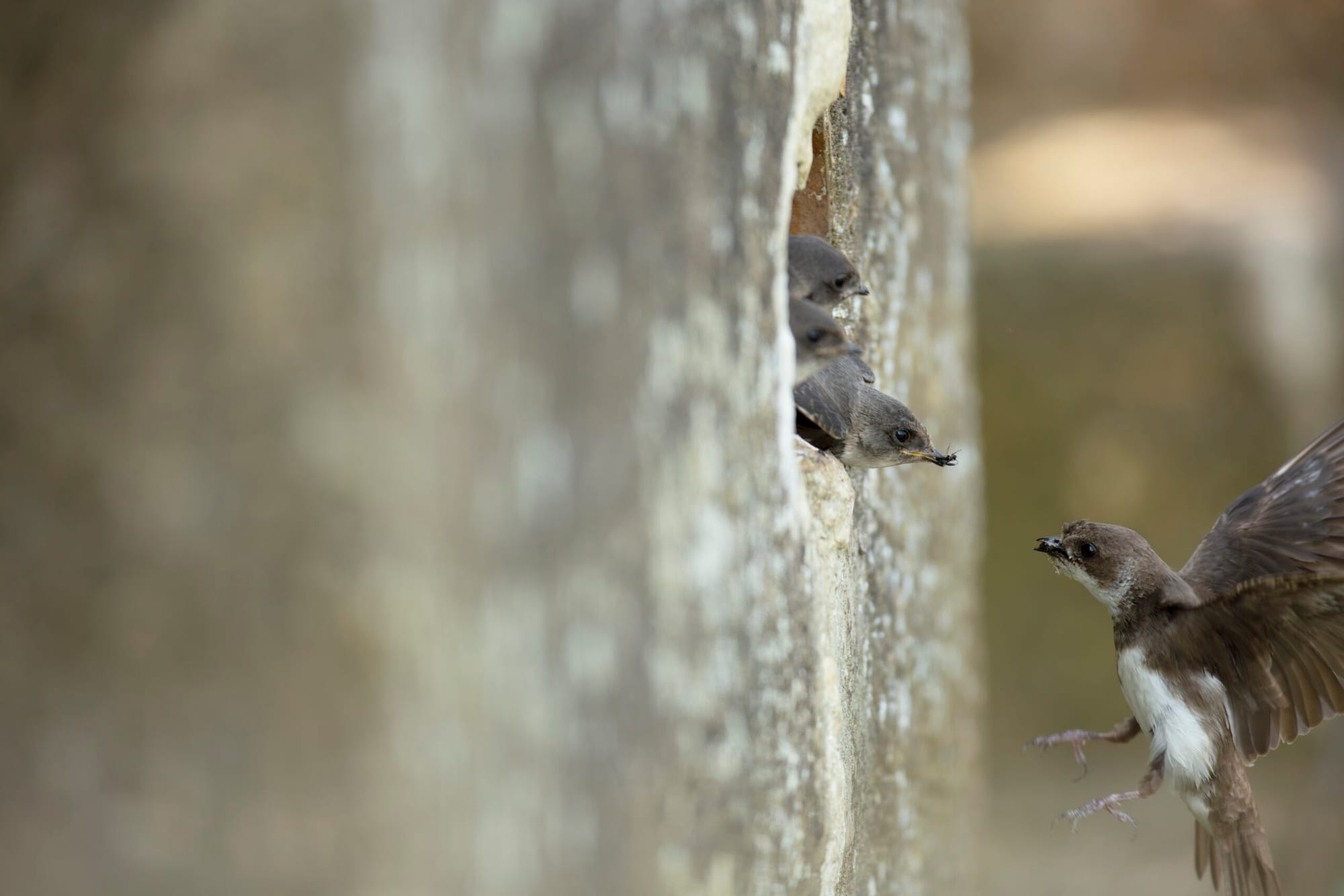 Sand Martins are the smallest European hirundines (the collective name for martins and swallows). They have dark brown upper parts and dark under wings, contrasting with pale under parts divided by a distinctive dark chest stripe. They are agile fliers, feeding mainly over water, and migrate to the UK from Africa to breed. Sand Martins dig burrows to nest, usually making their nest holes in steep sandy cliffs, riverbanks, or gravel pits.