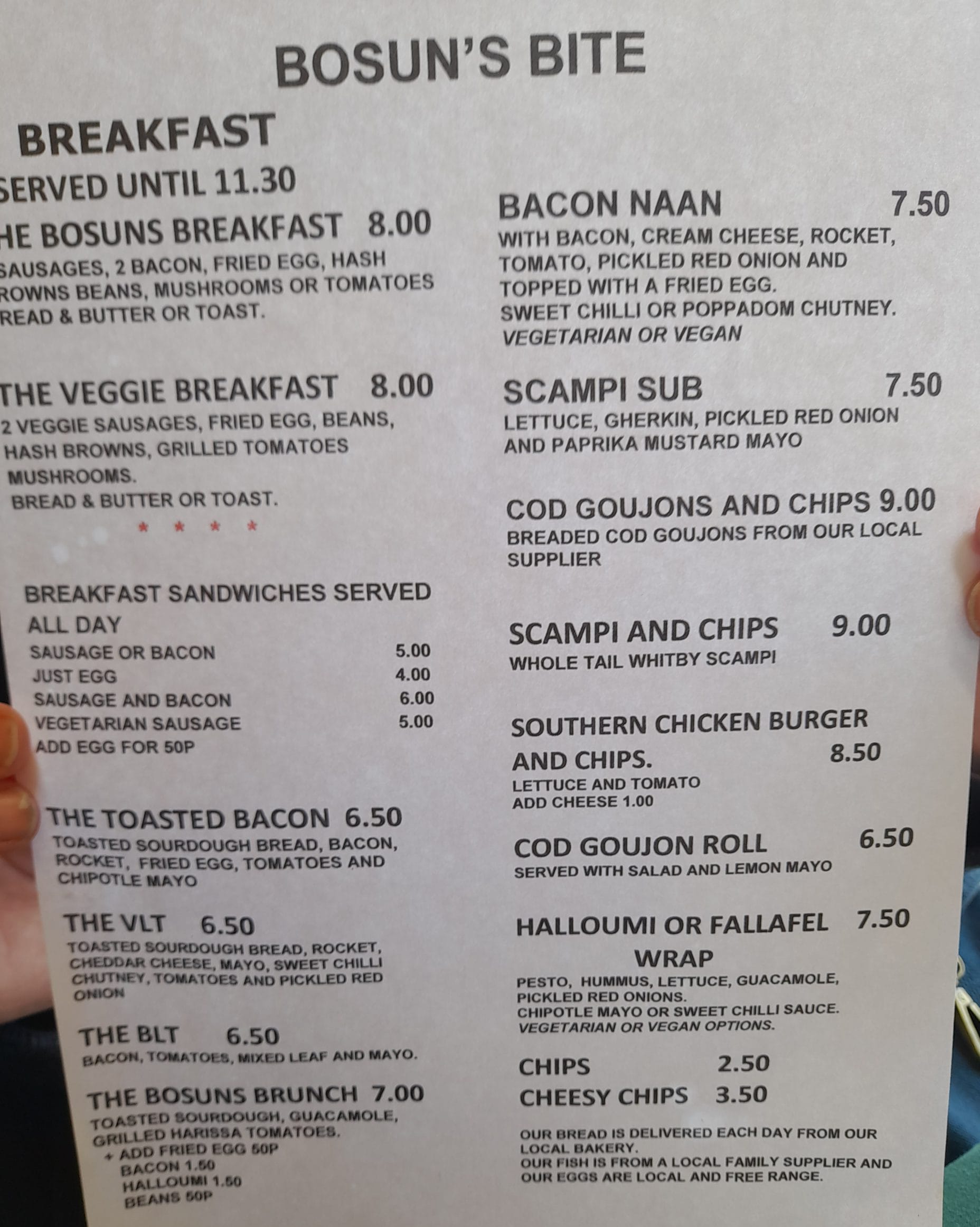 With a choice of indoor or outdoor seating, it is a lovely setting to enjoy a choice of traditional English fayre such as a full English breakfast (with a veggie option too), BLT sandwiches, scampi or cod goujons (made from fresh fish delivered daily) and chips, or a slice of lemon drizzle cake and coffee. There are also interesting and tempting twists on the usual options such as naan bread filled with bacon, cream cheese, rocket, tomato, pickled red onion topped with a fried egg and choice of chilli or poppadom chutney. There is something for everyone as the menu includes vegetarian, vegan and gluten free options. The vegetarian Bosun’s Brunch offers guacamole, grilled harissa and tomatoes on toasted sourdough bread. All the choices sound tasty and very filling and, as portions are large, the prices are good value.