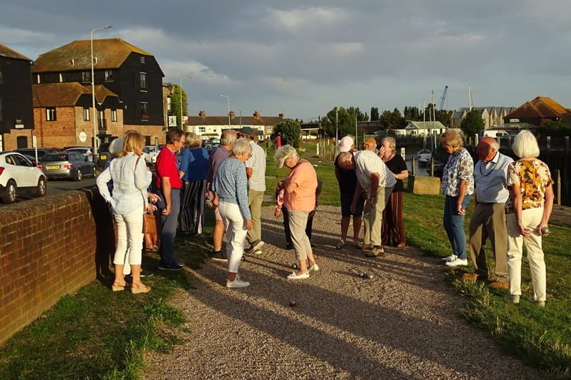 Clash of 'Les Titans' happened once again on Wednesday, August 23 between the two Rye and District u3a boules teams, when they came together for an evening challenge match on Strand Quay. Following their defeat earlier in the season, the Tuesday group asked for a rematch with the Wednesday group. Lines were drawn again and under the gaze of interested Rye visitors, battle commenced between 'Les Bleus' (Wednesday) and 'Les Verts' (Tuesday) players.
