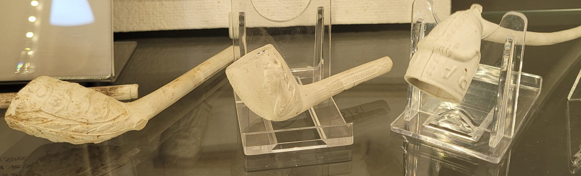 Amongst the clay pipes on display in East Street is an example of one of very few complete Buffalo pipes decorated with buffalo horns and the letters RAOB. This was made for the Royal Antediluvian Order of Buffaloes (RAOB), a fraternal society, similar to a Masonic lodge, founded in 1822. The order worked to raise money for the care of the sick and homeless. According to records of 1848, clay pipes were used in initiation ceremonies and were broken over the members heads, so whole pipes are rare.