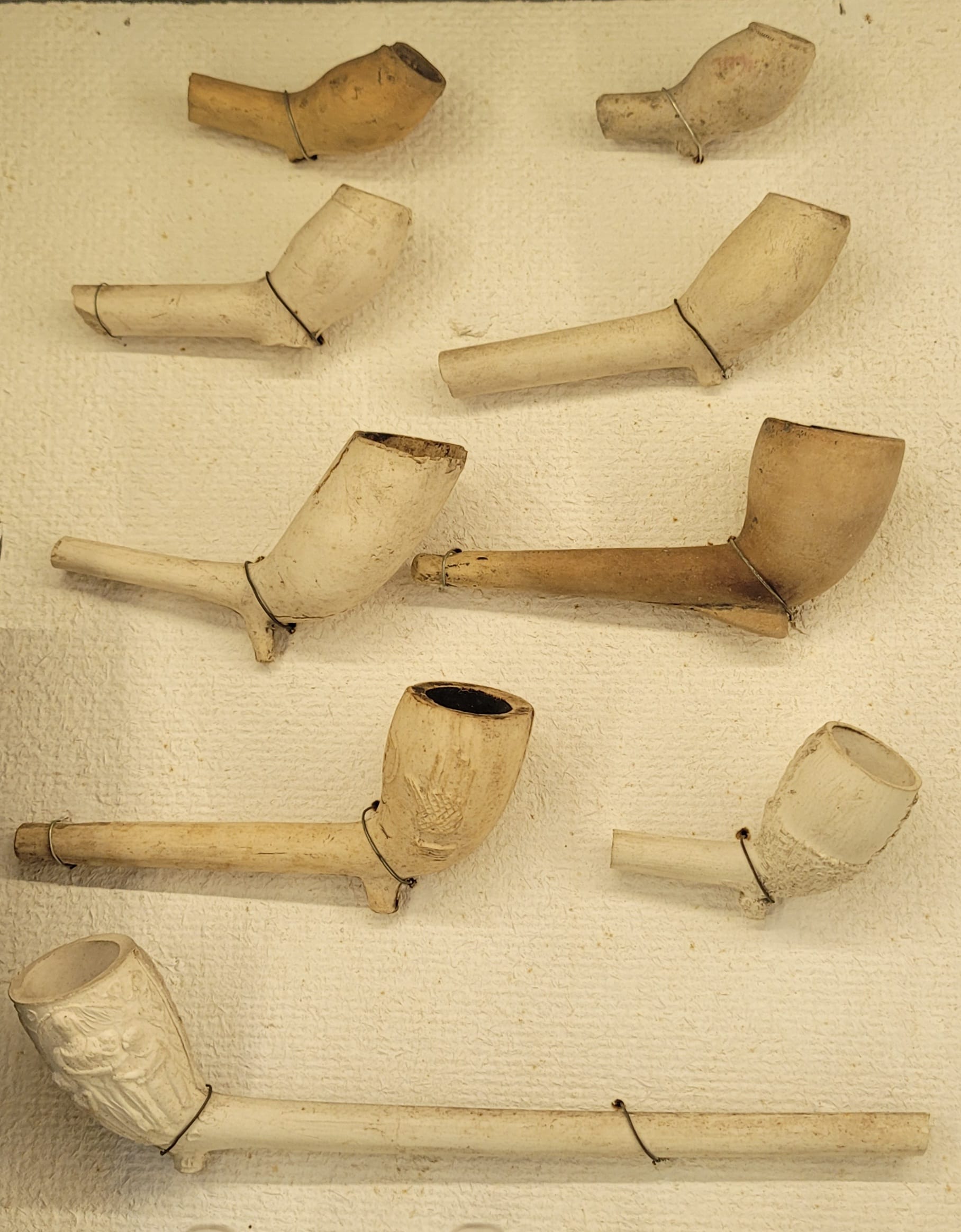 The designs of clay pipes changed over time and there were also regional variations. Pipes can be dated by looking at the thickness and length of the stem, the size and design of the bowl and the maker’s mark. The bowl of the pipes developed over time: in the 16th century the heel of the bowl was usually flat but by the 18th century there was a spur on the heel and pipes began to be decorated. Tobacco was expensive from when it was introduced to the mid-16th century so the pipe bowls were small but as tobacco became cheaper, the bowls grew bigger.
