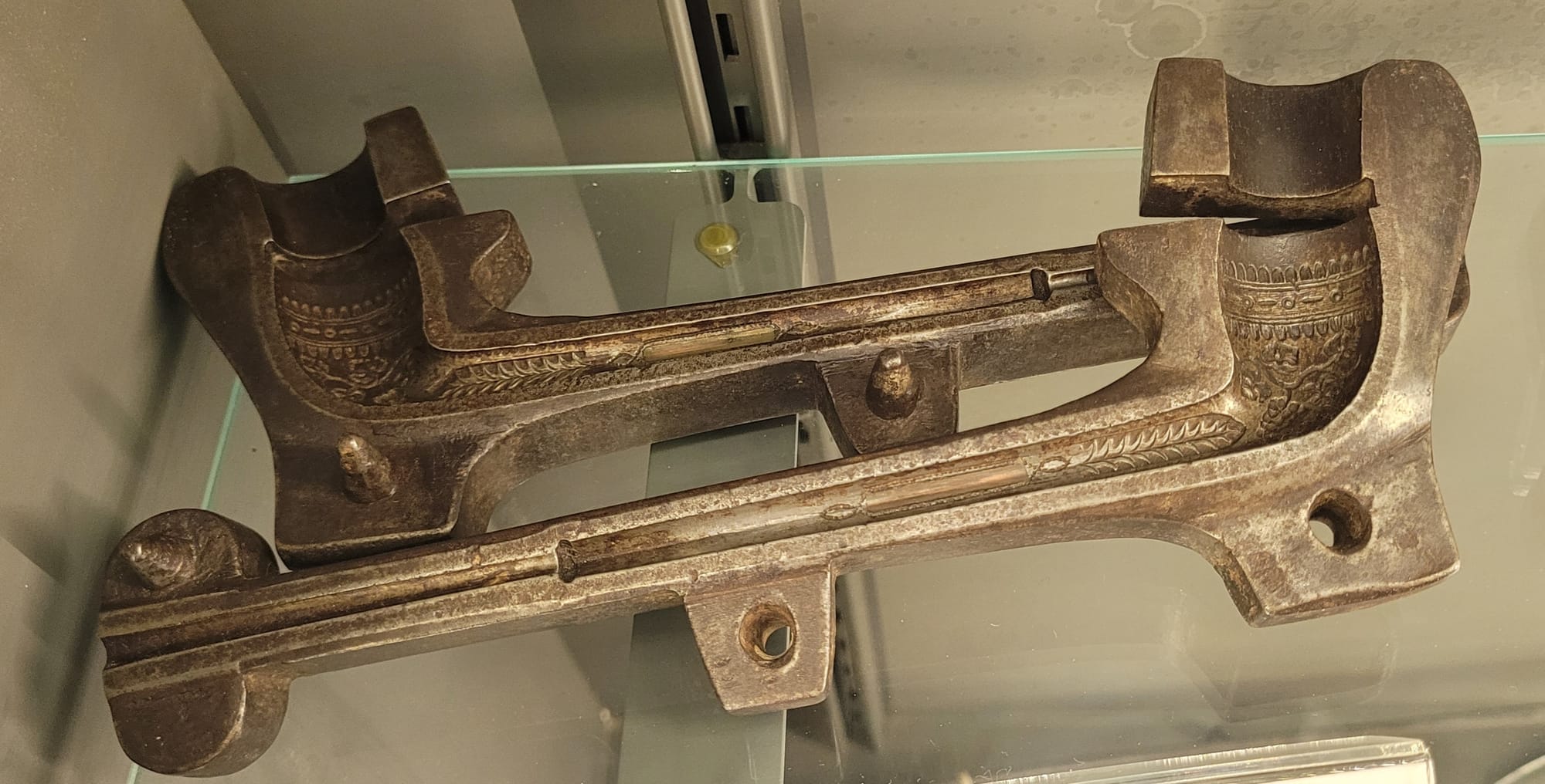 The latest museum object in this series is a clay pipe with decoration of a foot kicking a ball, part of a selection of other decorated pipes and metal pipe making moulds, that can be seen in East Street. The museum has a large collection of complete clay pipes and fragments, many found in 1917 in the cellar of Bannisters Ironmongers on the corner of Cinque Ports Street and Ferry Road. Pipes were made in such large quantities and were often discarded after use, so many clay pipes survive, though often not intact due to their fragility. Clay pipes have been found all around Rye especially around back doors. A large number of broken pipes have been found on Hilders Cliff suggesting that this was the site of a pipe maker.