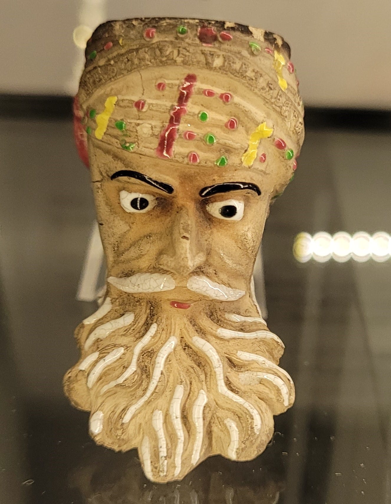 Another pipe in the collection is one with a highly decorated bowl in the shape of a bearded and turbaned man. This is known as a Jacob’s head pipe and most have the inscription “I am the real Jacob” written in French around the top of the head. Many were made in France, Germany, Belgium, Holland and England, from 1850-1930s and was one of the most popular head pipes as the colours stood out as the pipe was discoloured over time.