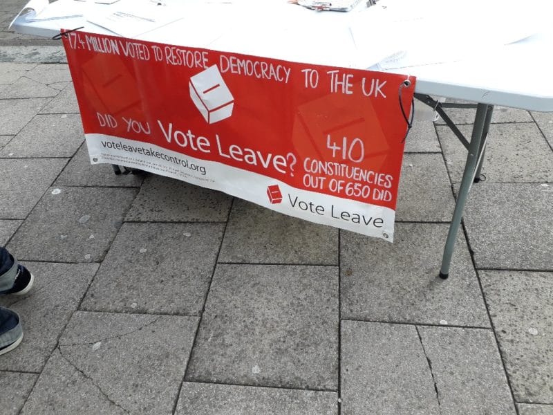 Just a few steps away was a similar stall for the Brexit camp, but with fewer people around it. An altercation happened at the Remain stall where a leaver ranted at a remainer putting a sticker on the board, accusing her of not believing in democracy, but the incident did not ecalate further.