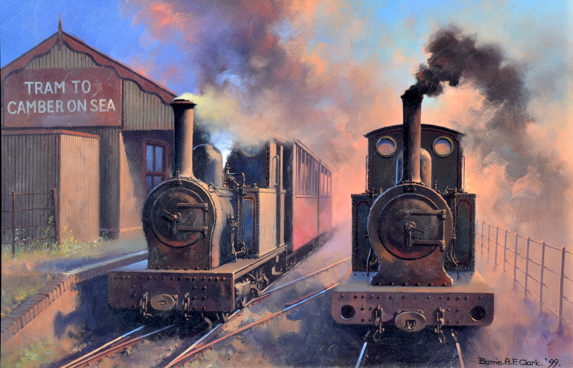 The original tramway - in reality a narrow gauge light railway - was originally constructed in 1895 primarily to convey golfers to Rye Golf Club. Rye Station was just off New Road, close to Monkbretton Bridge and almost adjacent to the buildings that now house the creative centre. The station was removed many years ago but the golf club station, complete with rails, can still be seen by the golf course and a little way behind the harbour master's offices. Later the line was extended, looping round the southern edge of the golf course towards Camber. The line was closed to civilian passengers in 1939 and by 1945 was considered to be in such poor condition that the majority of it was ripped up and sold for scrap.