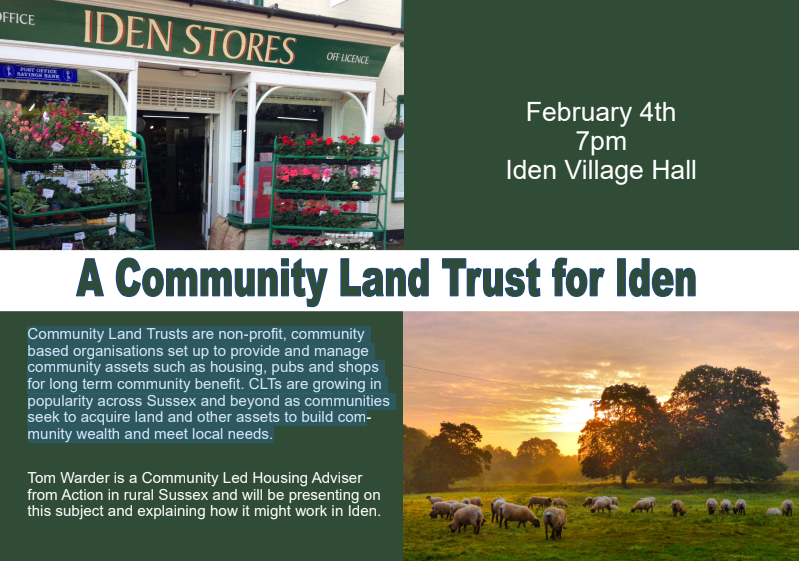 Plans for new homes in Iden will be discussed next month. A meeting at Iden Village Hall on February 4 will hear about proposals for a community land trust (CLT), a not for profit community based organisation that manages local assets such as housing, pubs and shops. CLTs are growing in popularity, with 30 established in Sussex and over 350 nationally.