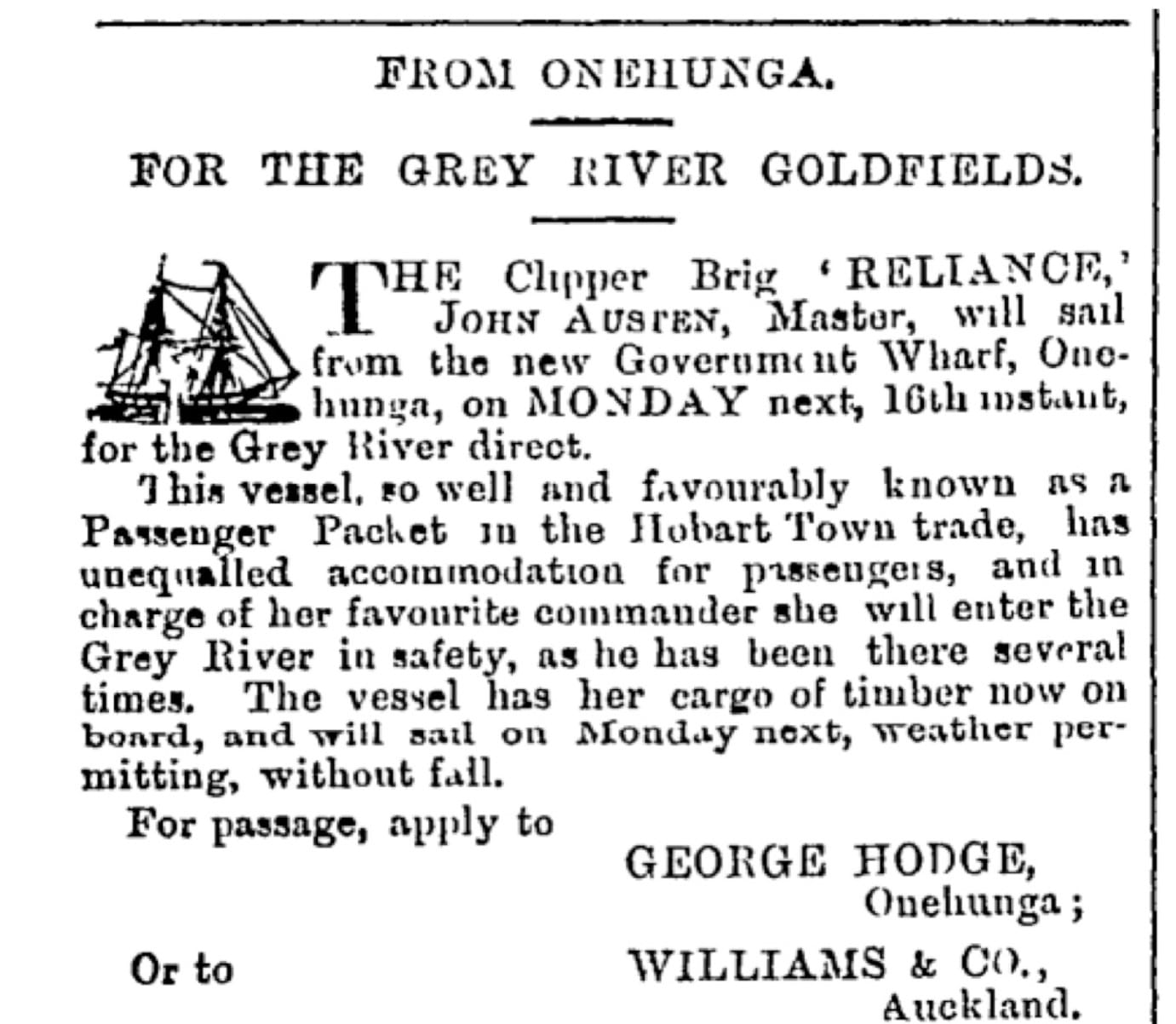 Below is an example of the newspaper advertisements seeking passengers for the Reliance.