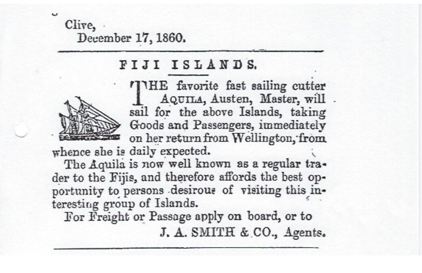 Success with his business enabled him to further upgrade his boat and, in late 1858, he purchased the 48 foot Aquila. This larger vessel enabled him to trade in the Pacific Islands where he took various goods and people to the islands and primarily brought fruit back to New Zealand. This was similar to his work in the orange trade to England from the Mediterranean. A typical advertisement for the Aquila is as below;