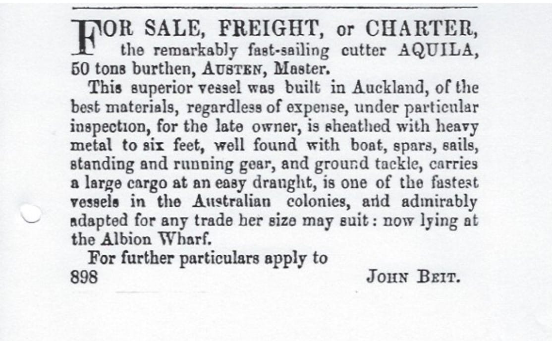 In April of 1865 he made another step up by purchasing the 85 foot brigantine Reliance which enabled him to sail further out into the Pacific Islands and to Australia carrying larger cargoes. He also shipped timber that had come from the kauri forests of the North Island down to the South Island townships that were rapidly growing. Aquila was advertised for sale as shown here.