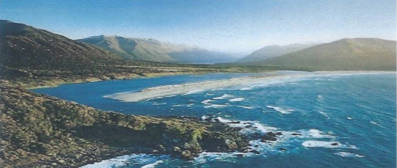 The photo below shows the narrow opening of the bar. I have visited this bay and felt in awe of the incredible skill shown by John in navigating a 48 foot sailing ship through the treacherous opening and down the narrow stretch of water leading into Martins Bay.