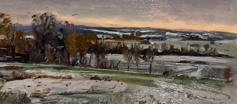 An accomplished and prolific en plein air painter, Karl Terry is inspired by the landscapes and seascapes of Kent and East Sussex, around the country and further afield. His paintings of Camber and Rye Harbour, Dungeness, the big skies of the marsh and the landscape around his Isle of Oxney home and studio, are expressive responses to the changing light and weather conditions. Light glints off rivers and the sea, marram grass bends and sways in the wind on Camber dunes, waves crash on rocks, and moody ever-changing skies are captured with broad expressive brushstrokes. He uses colour to capture light – the golds of a low winter sun, the brightness of the reflections off water, muted mists, the bluey-purple of snowy shadows. All of which gives his work so much immediacy and atmosphere.